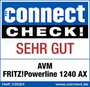 Der AVM FRITZ!Powerline 1240 AX WLAN erzielt im Einzeltest des Magazins „connect“ das Gesamtergebnis „SEHR GUT“. Die Ausstattung überzeugt u. a. mit zwei Gigabit-Ethernet-Buchsen und Wi-Fi 6. Außerdem kann der WLAN-Repeater hohe Übertragungsraten ermöglichen.