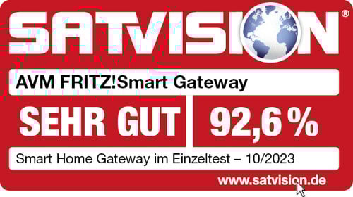 Das Testmagazin „SATVISION“ prüft den AVM FRITZ!Smart Gateway im Einzeltest. Das die sehr einfache Einrichtung/Installation überzeugt. Die Bedienung ist sehr einfach. Das Gerät hat eine sehr hohe Kompatibilität. Außerdem punktet die umfangreiche Ausstattung. Das „vielseitige und simpel zu bedienende“ AVM-Gateway erreicht das Testurteil „SEHR GUT (92,6 %)“. Auch Preis/Leistung ist „sehr gut“.