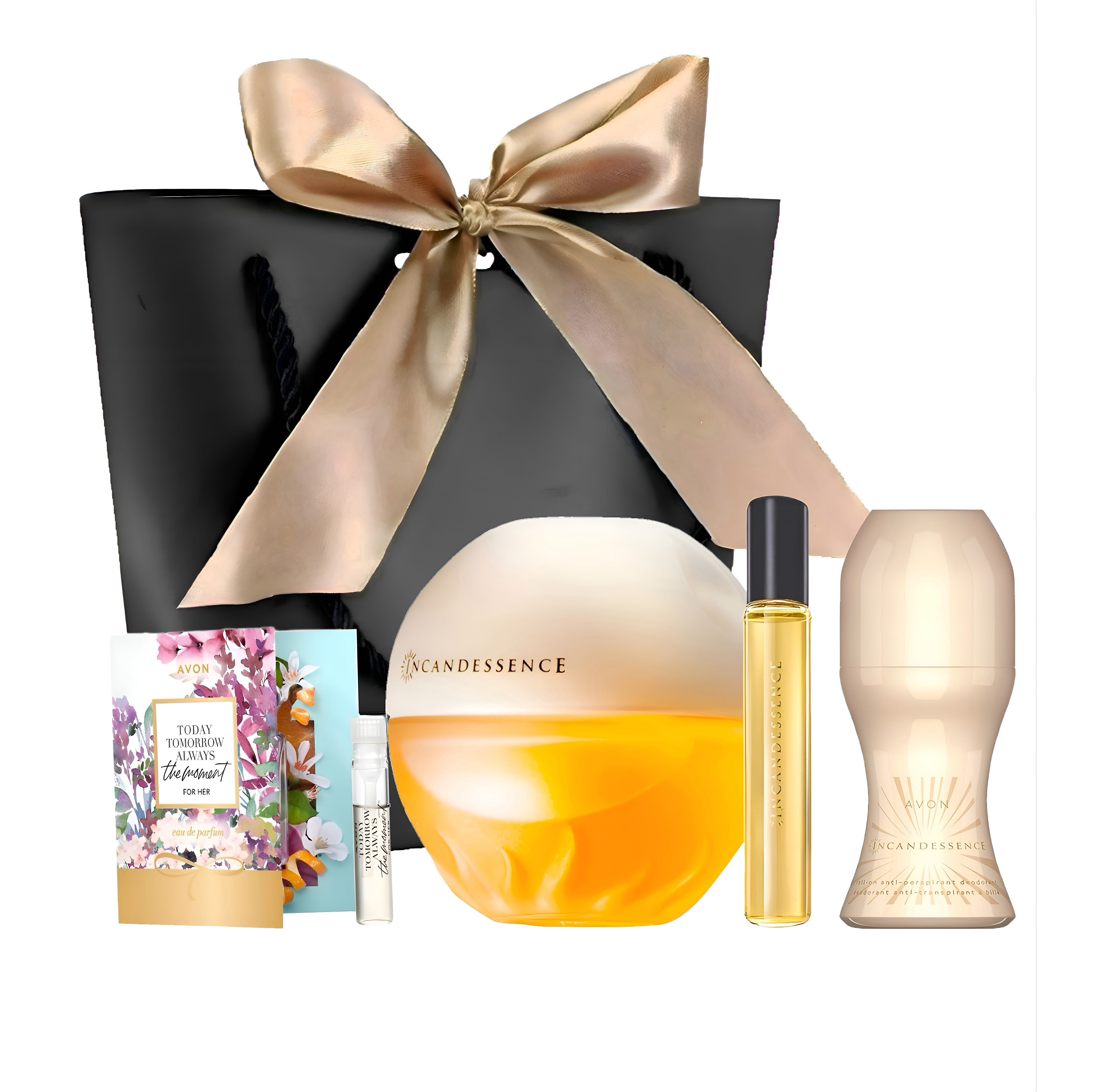 Lieferumfang | INCANDESSENCE Eau de Parfum Spray 50ml, Taschenspray 10 ml, Deoroller 50 ml Geschenktasche Duftprobe |