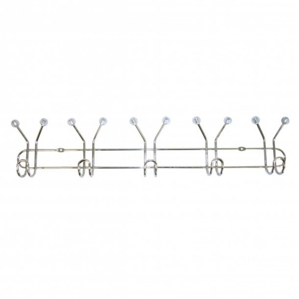 Garderobenleiste zur platzsparenden Erweiterung von Hängemöglichkeiten für Textilien, mit 15 Aufhängern – ein Mehrwert in Bad, Flur, Ankleide-, Aufenthalts- und auf kleinem Raum Zur Wandmontage mittels Schrauben, Befestigungsmaterial inklusive – Haken unten in geschwungener Form, oben mit Softballs zur Abrundung Aus Eisen, verchromt, Farbe: silber, Softballs aus Kunststoff, Farbe: transparent – schafft zusätzlichen Stauraum auf kleiner Fläche Ideal für Hand- und Duschtücher, Bademäntel sowie Jacken, Wintermäntel, längere Kleider, Hüte, Mützen, Schals, Tücher, Kleiderbügel, aber auch den Schlüsselbund, Deko usw. Maße: ca. 45,5 x 10 x 4 cm, max. Tragkraft: 5 kg