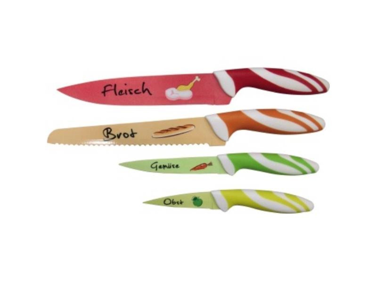 AXENTIA 175478 axentia Messerset je 1 x Brotmesser ca. 32,5 cm Fleischmesser ca. Formschön · farbenfroh und funktionell: Das 4-teilige Messer-Set ist ein praktischer Helfer für die moderne Küche. Jedes der bunten Messer ist individuell beschriftet und hat einen ansprechenden Aufdruck · welcher auf den optimalen Verwendungszweck hinweist. Das rote Messer eignet sich ideal zum Schneiden von Fleisch · während das orangefarbene Sägemesser als ?Brot- Experte fungiert. Mit dem grünen Messer lässt sich prima Gemüse kleinschneiden und das gelbe ist für Obst aller Art gedacht. Jedes der vier Messer besteht aus Edelstahl und kann leicht gereinigt werden. Damit steht einem sauberen und hygienischen Arbeiten in der Küche nichts mehr im Weg. Ob Obst · Gemüse · Brot oder Fleisch - die schönen Motive und die bunte Optik sorgen für gute Laune in jeder Küche.