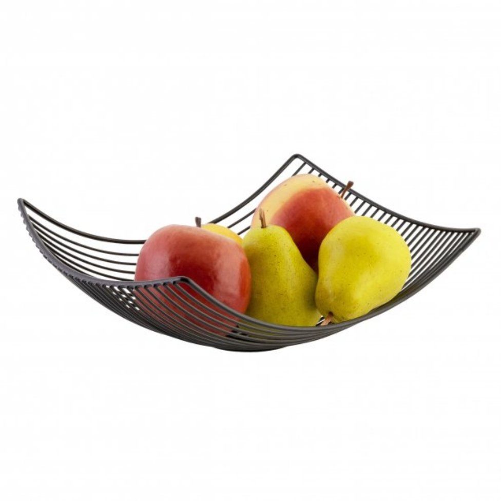 Formschöner Korb in geschwungener, rechteckiger Schalenform – zur stilvollen, dekorativen Aufbewahrung von Obst und Früchten, aber auch Präsentation von Brot und Brötchen Attraktiver, minimalistischer Streben-Look für eine moderne Optik – kantige Ecken als reizvoller Kontrast zu dem sonst abgerundeten Design Aus Eisendraht, pulverbeschichtet, Farbe: schwarz – dezente Farbgebung, außergewöhnliche Form – runder, leicht erhöhter Standfuß Schmale Drahtstreben, daher auch zum Ablegen von Aprikosen, Erdbeeren etc. verwendbar – ebenso perfekt als Deko-Schale geeignet, zum Beispiel mit Lichterketten oder Kunstblumen Maße: ca. 31 x 10 x 23 cm, Gewicht: ca. 460 g