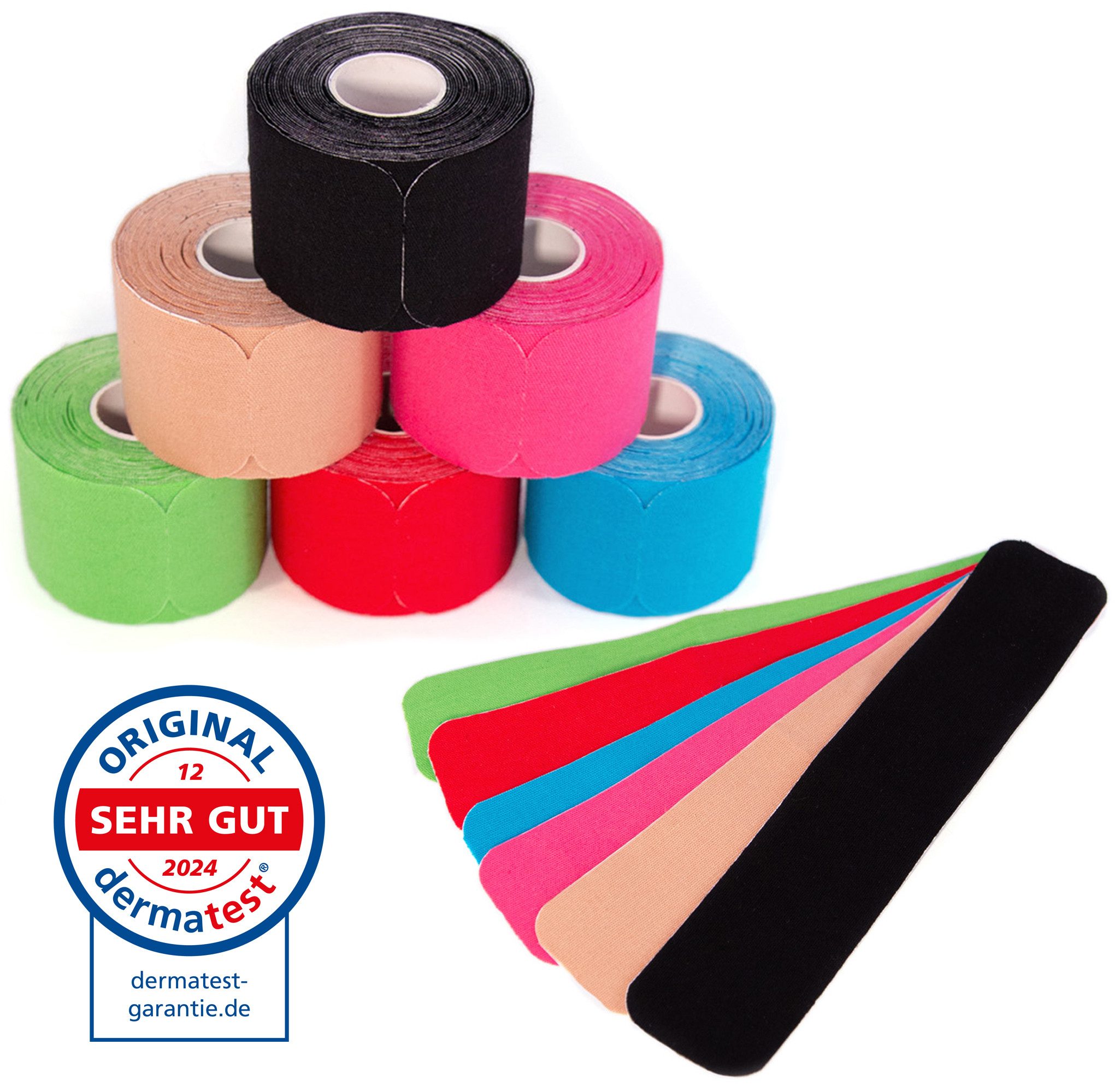 Sie erhalten 6 hochwertige Kinesiologie-Tapes PRECUT 25 x 5 cm in den Farben grün, rot, blau, beige, pink und schwarz.