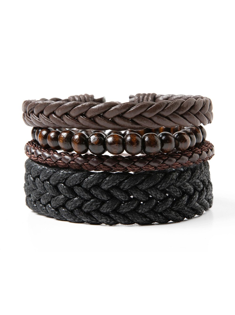 Armbänder Sets: Drei Vintage verstellbare geflochtene Lederarmbänder und ein Holzperlenarmband in einem Set. Verschiedene Farben und Stile können problemlos zum täglichen Tragen passen.