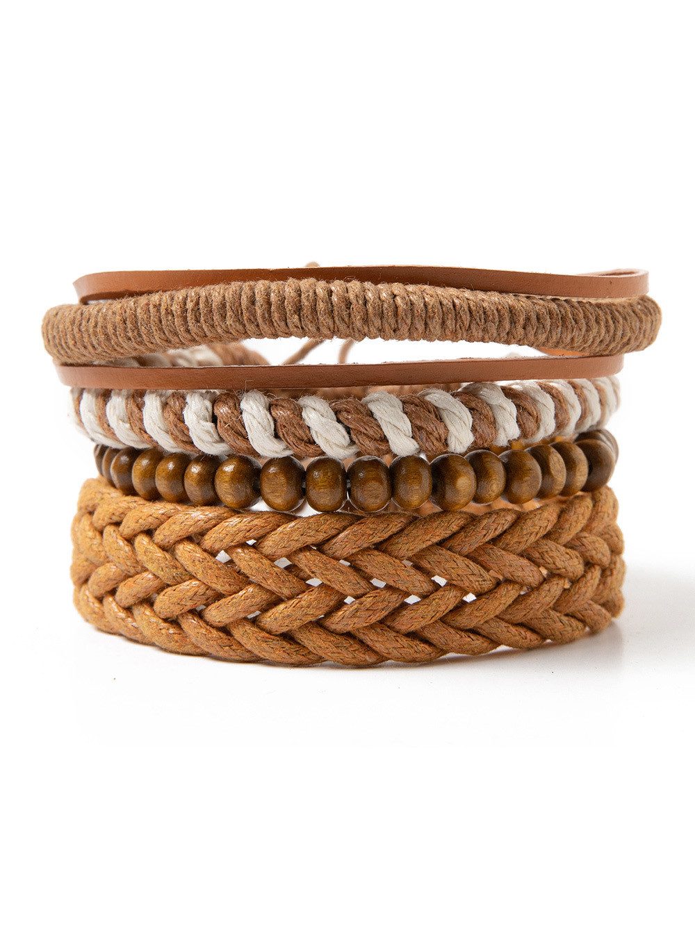 Drei Vintage verstellbare geflochtene Lederarmbänder und ein Holzperlenarmband in einem Set.