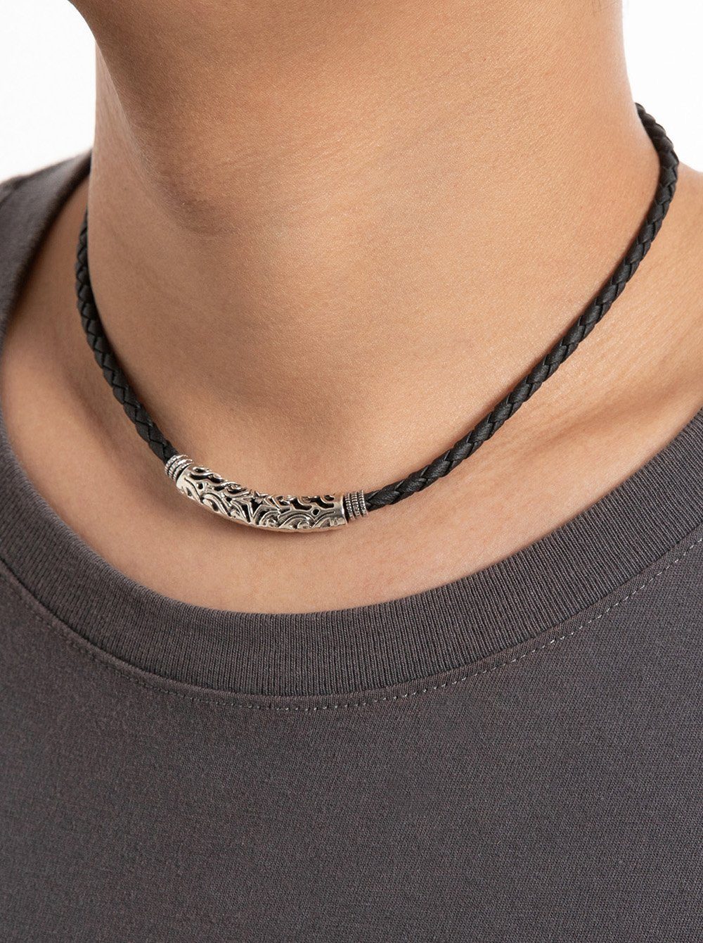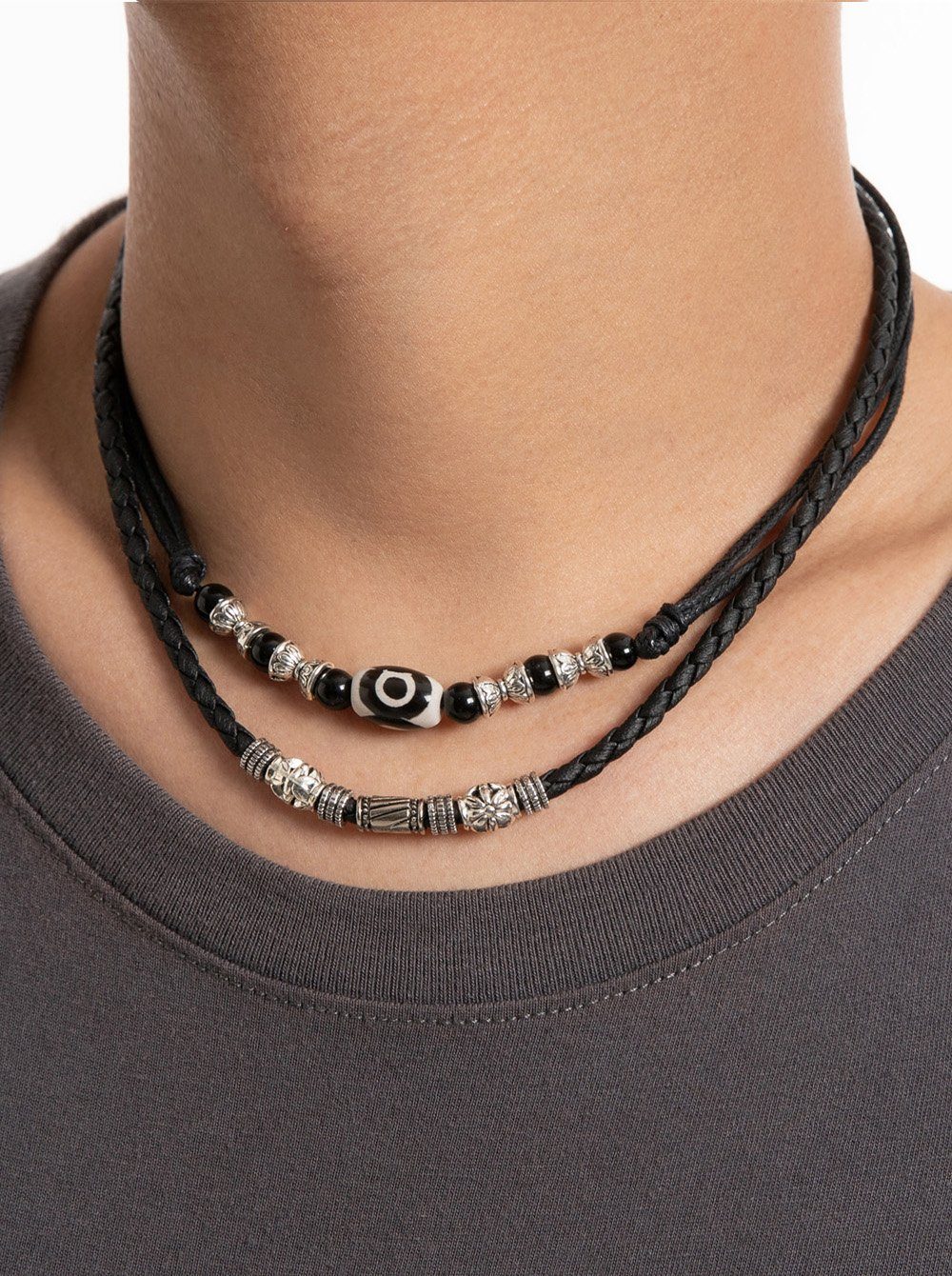 Modell 1: Die Halskette besteht aus geflochtenem PU-Lederband. Zusammengefügt wurde die Halskette aus eine große Mittelperle und 2 keinen Perlen aus Edelstahl.