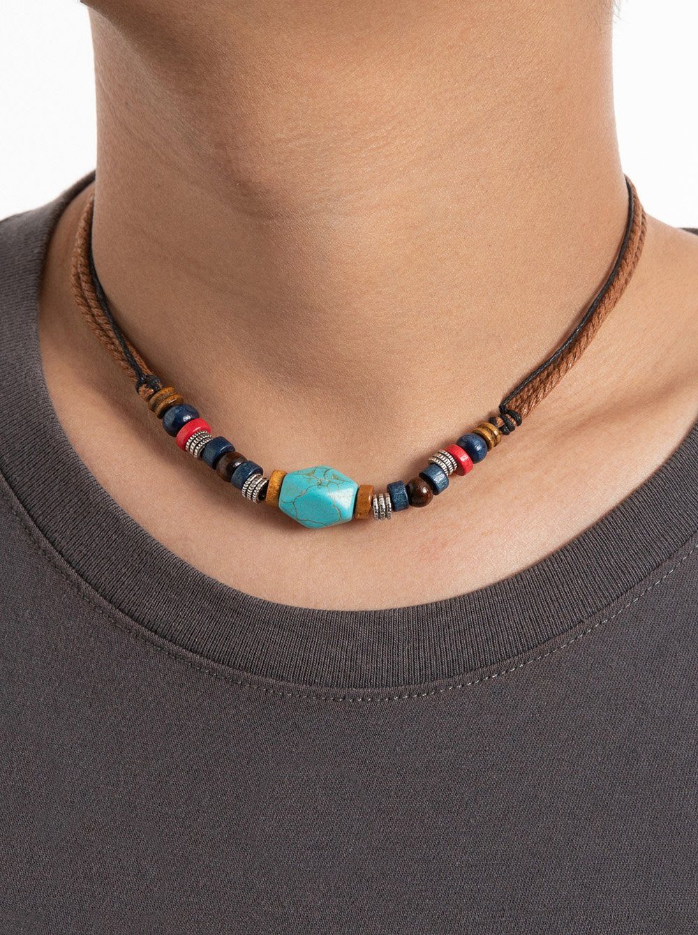 Modell 5: Die Halskette besteht aus Baumwollbänder und geflochtenem PU-Lederband. Zusammengefügt wurde die Halskette aus Porzellan-, Glas- und Edelstahlperlen.