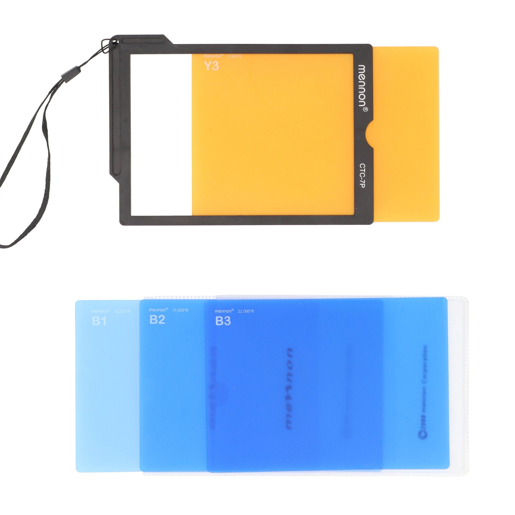 Das Set besteht aus einer Weißabgleich-Karte, einer gelben, zwei orangefarbenen und drei verschiedenen blauen Karten. Die Karten sind aus stabilem, semi-transparentem Kunststoff gefertigt und können zum Gebrauch in den zugehörigen Rahmen mit Handschlaufe gesteckt werden.
