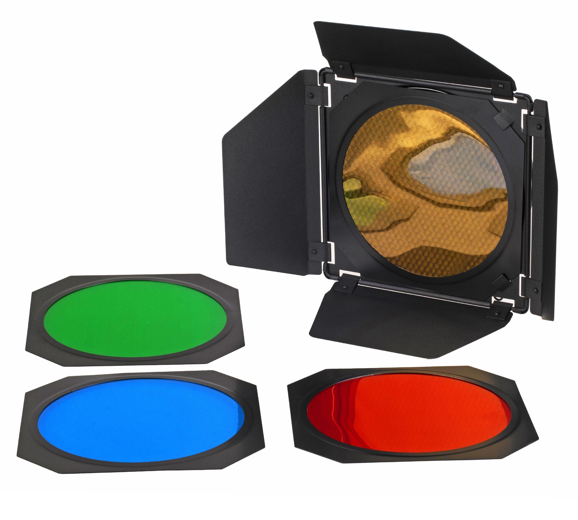 Mit unserem Barn Door Aufsatz können Sie die Lichtabgabe eines Studioblitzes hinsichtlich der Form oder der Farbe verändern.