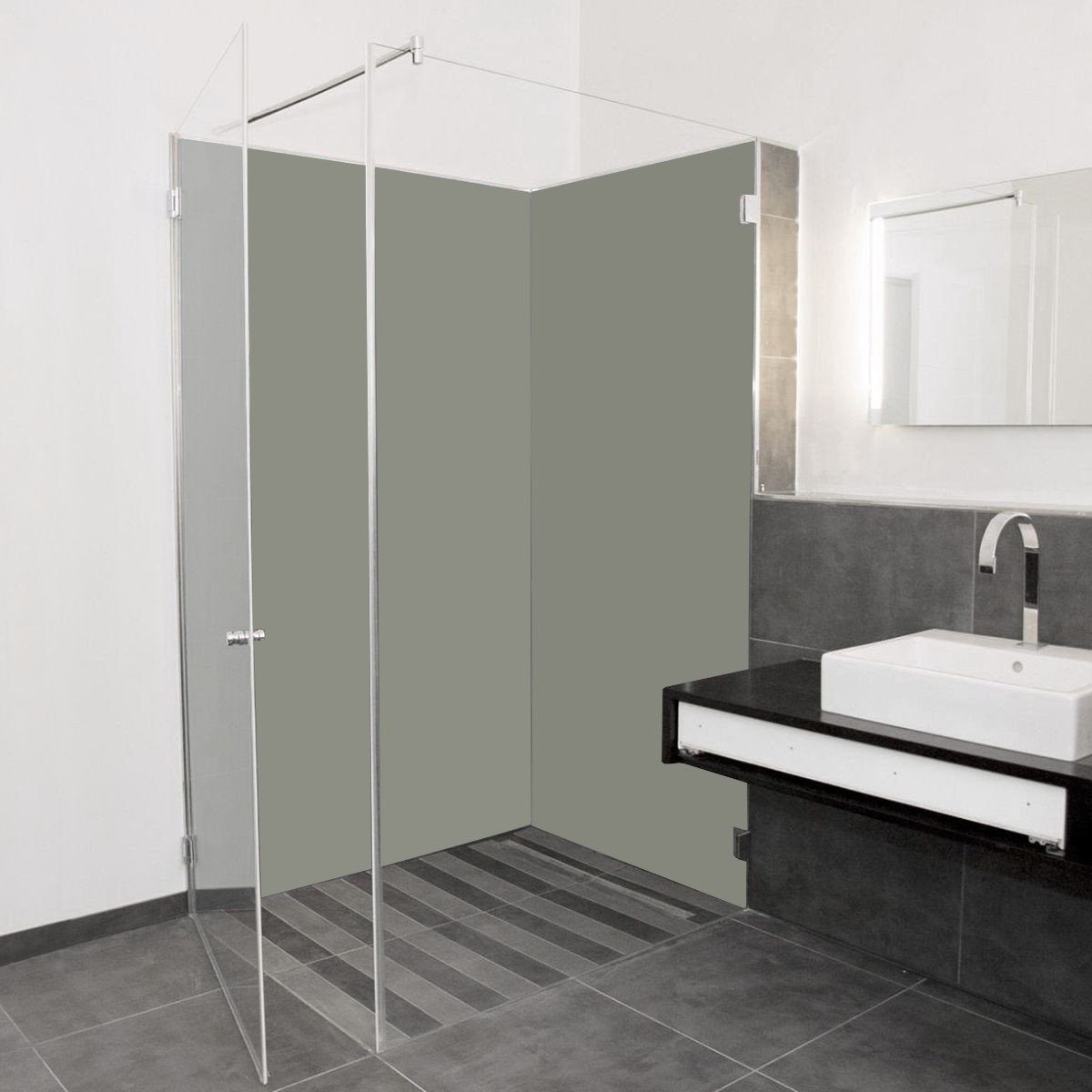 - Die Platten sind pflegeleicht. Trotz ihrer Kratzfestigkeit empfiehlt sich für die optische Langlebigkeit eine schonende Reinigung mit Badreiniger ohne Scheuerzusätze. Verwenden Sie keine Microfasertücher, oder Scheuerschwämme. Ein klassisches Fensterleder ist sehr gut geeignet. Die Verwendung eines Gummi-Abziehers nach dem Duschen ist auch empfehlenswert.