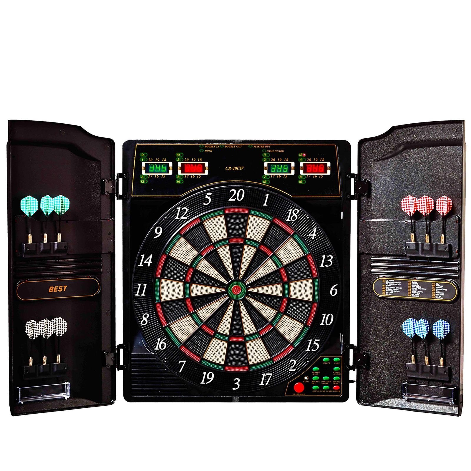 Das Best Sporting Dart-Kabinett Oxford EVOLUTION mit 27 Spielen in 159 Вариантыn verfügt über digitale Soundeffekte mit verstellbarer Lautstärke. Die vier sparsamem LED-Displays des elektrischen Dartboards zeigen die Spielstände von bis zu 16 Einzelspielern oder 8 Teams mit je 2 Spielern. An den Innenseiten der hochwertigen Kunststoff-Türen mit Walnussholz-Optik sind Halterungen angebracht in welchen die im Lieferumfang enthaltenen 12 Dartpfeile und Ersatzspitzen ideal verstaut werden können.