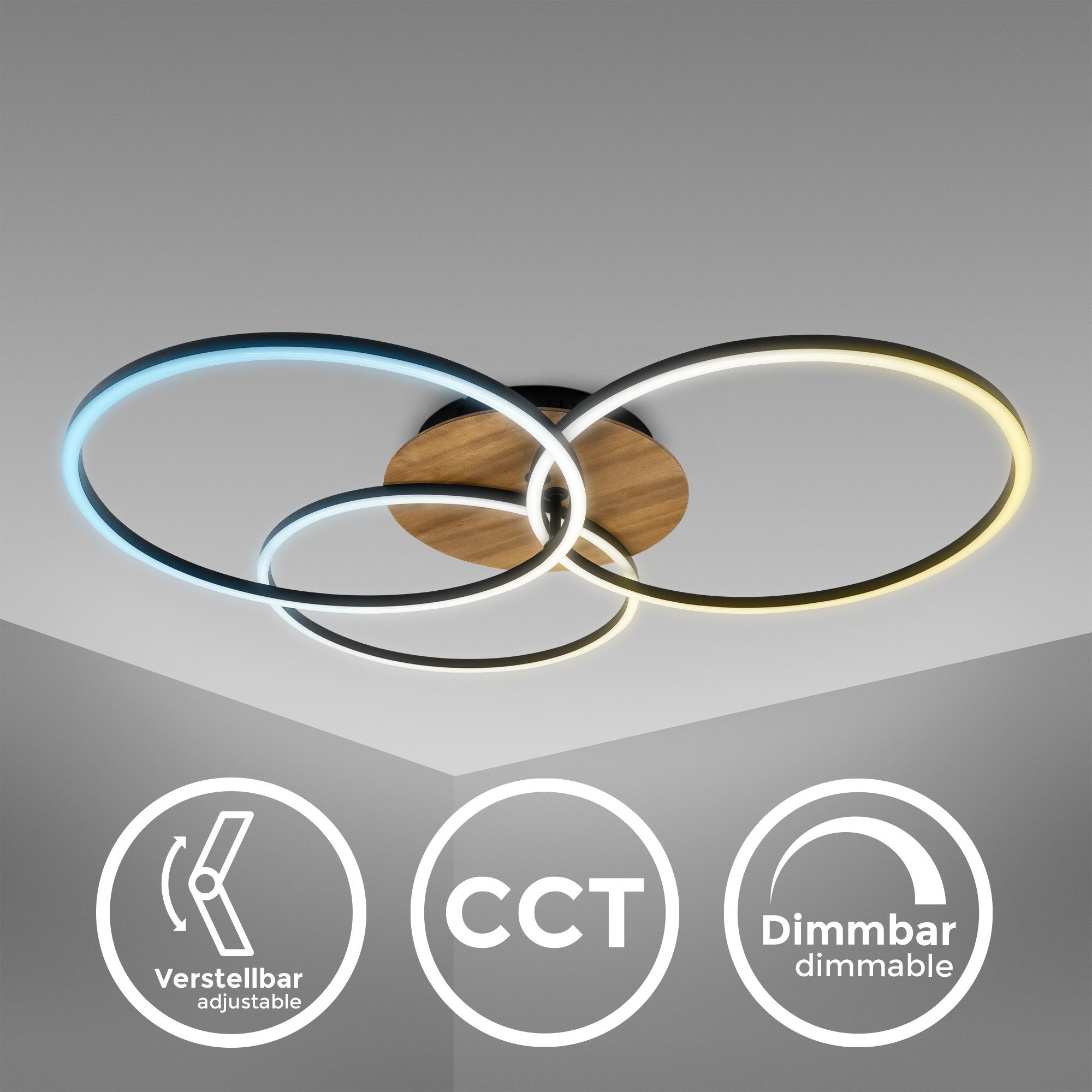 Wissenswertes | CCT-LED Deckenleuchte - Metall-Kunststoff-Holz / schwarz- inkl. LED 40W 4.400lm - Lebensdauer 20.000h, Ra>=80 - dimmbar, inkl. Fernbedienung, Farbtemperatur einstellbar - 3000K-6500K, inkl. Memoryfunktion, inkl. Nachtlicht, inkl. - Timerfunktion, - drehbar - IP20 - 717x674x110mm (LxBxH) |