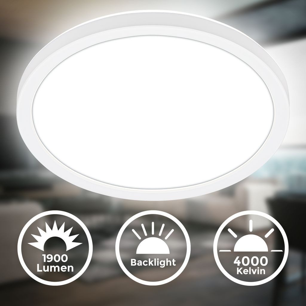 Wissenswertes | Ultraflaches LED Panel mit BacklightKunststoff / weißinkl. 1 x LED Platine 16W 1900lm 4000KLebensdauer 25.000h, Ra>=80on/offinkl. indirektem HintergrundbeleuchtungseffektIP20Ø240x30mm (DXH) |