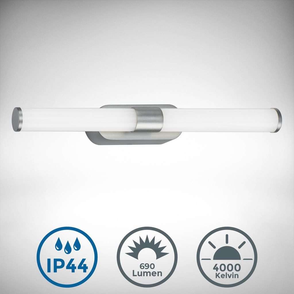 Wissenswertes | LED Wandleuchte Bad Kunststoff / chrom-matt Leuchtmittel: 7W 690lm 4000K neutralweiß Lebensdauer 25.000h, Ra>=80 nicht dimmbar IP44 Spritzwasserschutz Abmessungen: 400x65x45mm (LxHxB) |