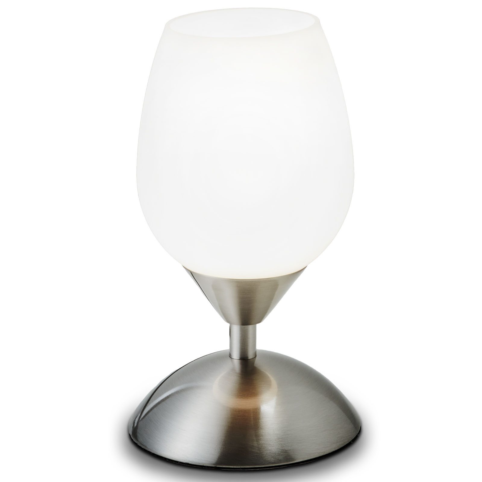 Wissenswertes | B.K.Licht Tischleuchte mit Touchdimmer Isa • Fassung: E14 [Leuchtmittel nicht inklusive] • Leuchtmittel: Halogen-Hochvolt / Standard AGL • Wattage max.: 25 Watt • Formen: Kugel / Tulpe / Zylinder • Spannung: 230V [Netzstecker] • Schutzart: IP20 • Material: Metall, Glas • Farbe: matt-nickel • Durchmesser Fuß: 126 mm • Dimmbar [Touchdimmer 4 Stufen] |