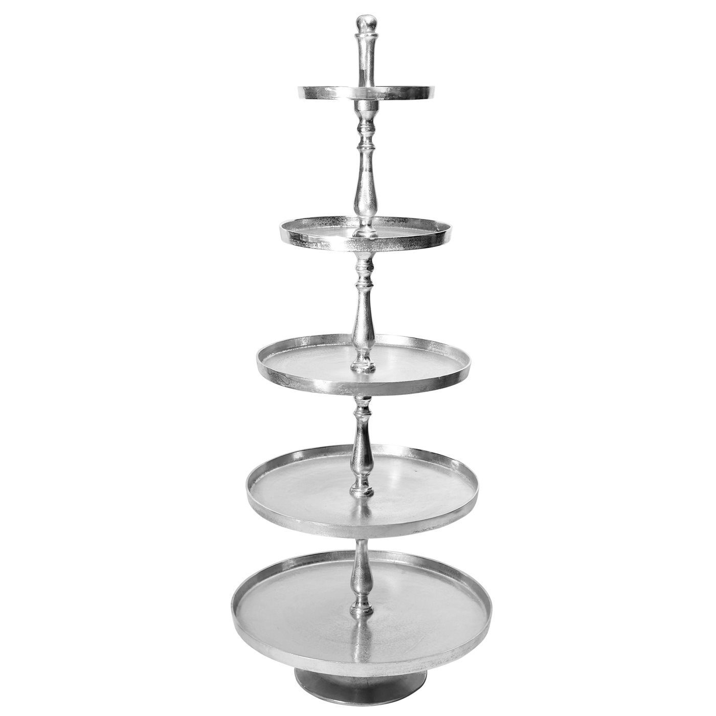 Unsere imposante XXL Etagere 150cm in silber ist aus Aluminium gefertigt und mit einem aufwendigen Antik-Finish versehen. Die Gesamthöhe von sagenhaften 150 cm bietet ausreichend Platz zur Präsentation von Dekoration, Pflanzen, Figuren oder Kerzen. Die Etagere 5 stöckig zieht alle Blicke auf sich, da die aufwendige Handarbeit und die Liebe zum Detail gleich ins Auge sticht. Handgearbeitete Finessen zieren eindrucksvoll die fünf großen Teller der Etagere. Sämtliche Ablageflächen verfügen über einen leicht erhöhten Rand, damit nichts herunterfallen kann. Die XXL Etagere 150 cm lässt sich mit wenigen Handgriffen zerlegen und platzsparend verstauen.