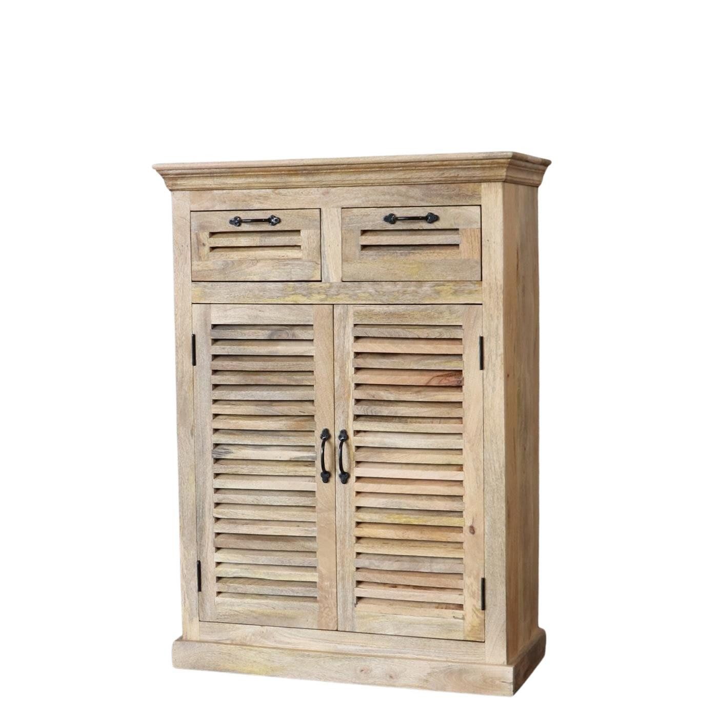 Absolut hochwertig - erstklassige Materialien - zeitlos schön ! Der prachtvolle Massivholzschrank ist in massiver Bauweise gefertigt und kann nicht demontiert werden und überzeugt als Schreinerstück auf ganzer Linie. Äußerst praktisch bietet der hochwertige Mehrzweckschrank ausreichend Platz und eignet sich als edler Schuhschrank, Flurschrank oder Badezimmerschrank. Ein absoluter Blickfang in jedem Eingangsbereich. Zusätzlich sind zwei geräumige Schubladen im Schrank integriert und bieten zusätzlichen Stauraum. Der Verwendungszweck ist sehr vielseitig und das Design lässt sich selbst zu modernem Einrichtungsstil kombinieren.