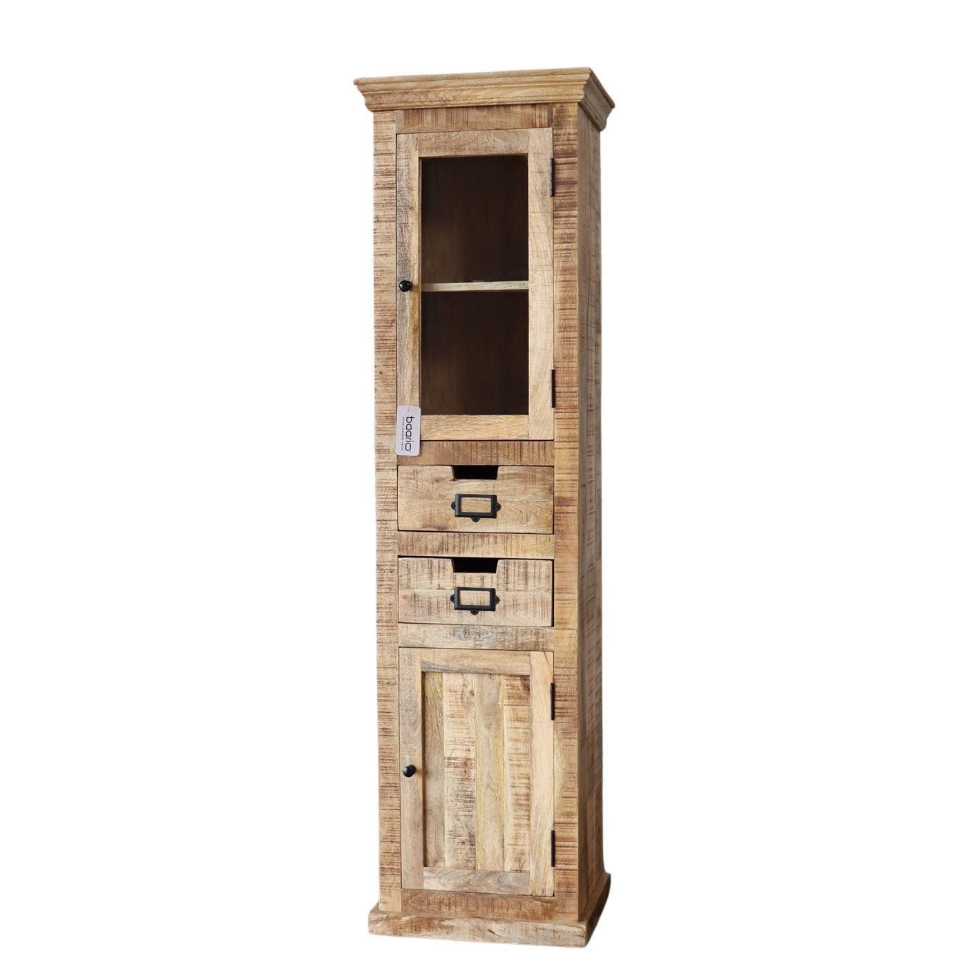 Liebe zum Detail wird bei diesem schmalen Badschrank zum Motto. Hinter den Türen aus Massivholz & Glas bietet dieses Prachtstück an Mehrzweckschrank ausreichend Stauraum. Der Korpus aus massivem, edlen Mangoholz ist in Massivbauweise in Handarbeit gefertigt und mit einem edlen Antik-Finish versehen. Das Design sowie die Formgebung im rustikalen Landhausstil bezaubert. Die Vitrine bietet zusätzlich zwei Schubladen. Die Antik-Lasur sorgt dafür das die natürliche Maserung intensiviert wird. In Handarbeit liebevoll gefertigt und aufwendig verarbeitet. Ein Möbelstück das über Generationen hinweg seine Liebhaber finden wird.