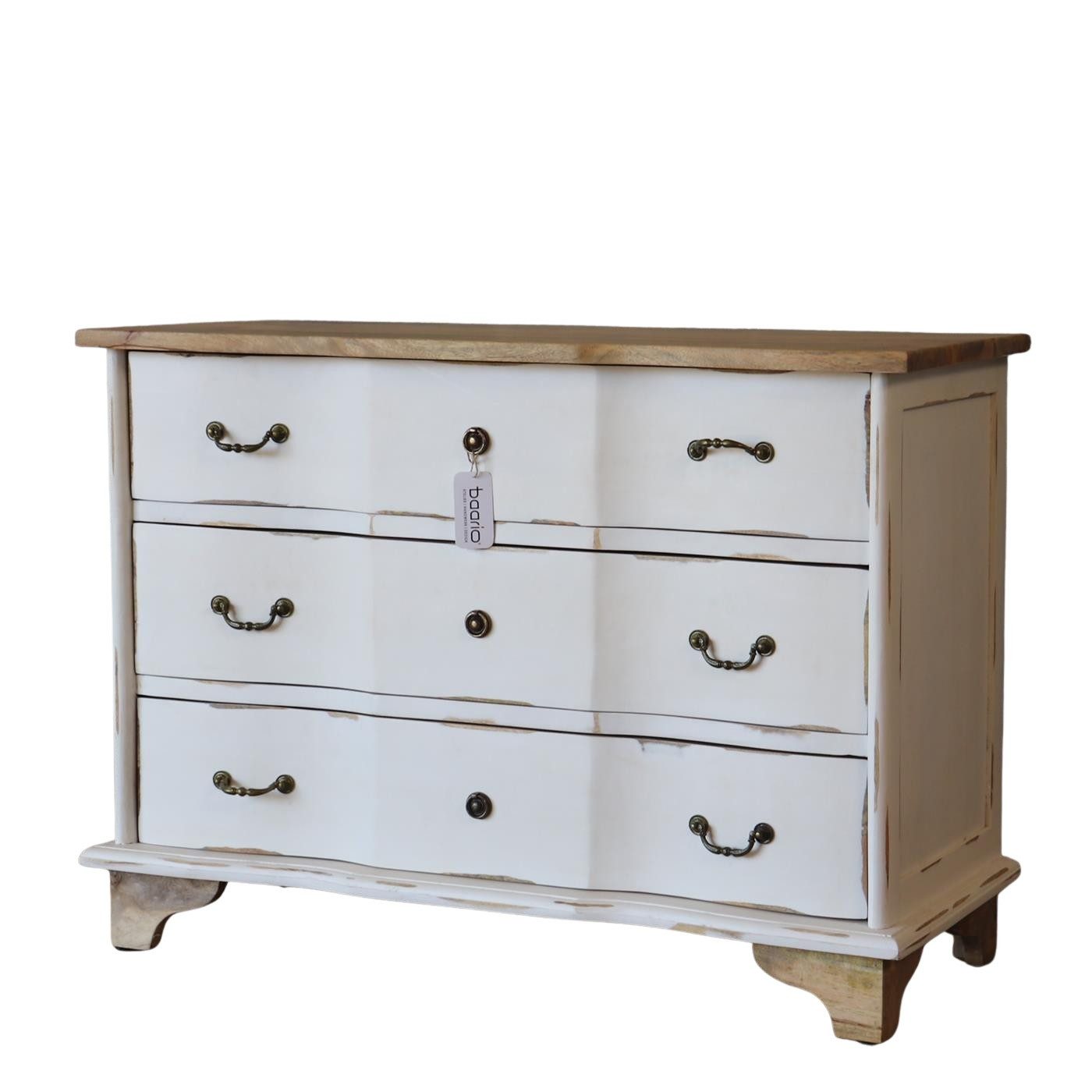 Dieses massive Möbelstück in mattem Shabby-Finish wird Liebhaber von klassischen Einrichtungsstilen begeistern. Aussreichend Stauraum durch 3 extra tiefe Schubladen. Durch die eleganten Griffe in französischem Antik-Design sowie der Farbkombination aus antikweiß mit warmen braun strahlt dieses Schmuckstück einen ganz besonderen Charm aus. Das Design dieser Kommode im XXL Format ist an den französischen Landhausstil angelehnt und wurde in liebevoller Handarbeit gefertigt.
