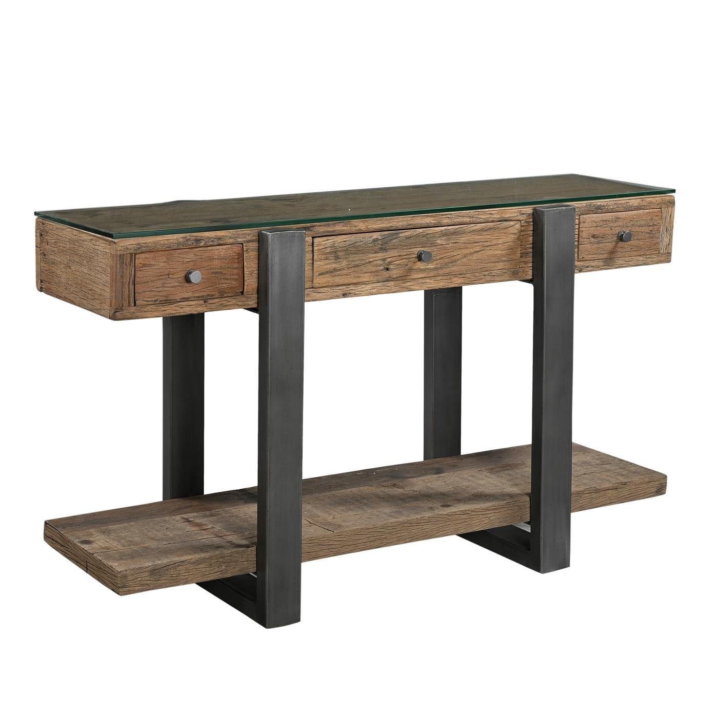 Unsere Serie GASCOG bietet echte Charaktermöbel die einen besonderen Platz in jeder Einrichtung verdienen. Die Möbelstücke sind aus naturbelassenem, recyceltem Altholz hergestellt und verleihen Ihrer Einrichtung einen natürlichen Charme. Jedes einzelne Möbelstück lässt sich hervorragend zu jedem Einrichtungsstil kombinieren. Ob Landhausstil, Shabby, Vintage oder auch in einer modernen Einrichtung. Definitiv ein ästhetischer Kontrast in Ihrem Zuhause. Jedes einzelne Stück ist aufgrund der unterschiedlichen, natürlichen Maserung ein Unikat. Verwitterung, Rillen, kleine Löcher und Schlieren sind Charaktereigenschaften der Oberflächenstruktur. Selbst das matte Eisen wurde dementsprechend verarbeitet und überzeugt durch kleine Used-Look Merkmale. Der schöne Konsolentisch aus Altholz und Metall bietet ausreichend Platz und bietet stilsichere Ablageflächen. Als Flurmöbel ideal geeignet, kann er auch in Ihrem Wohnzimmer, der noblen Kanzlei oder Ihrem Büro sein Plätzchen finden um Ihre Deko-Objekte in Szene zu setzen. Insgesamt 3 Schubladen bieten zusätzlichen Stauraum.