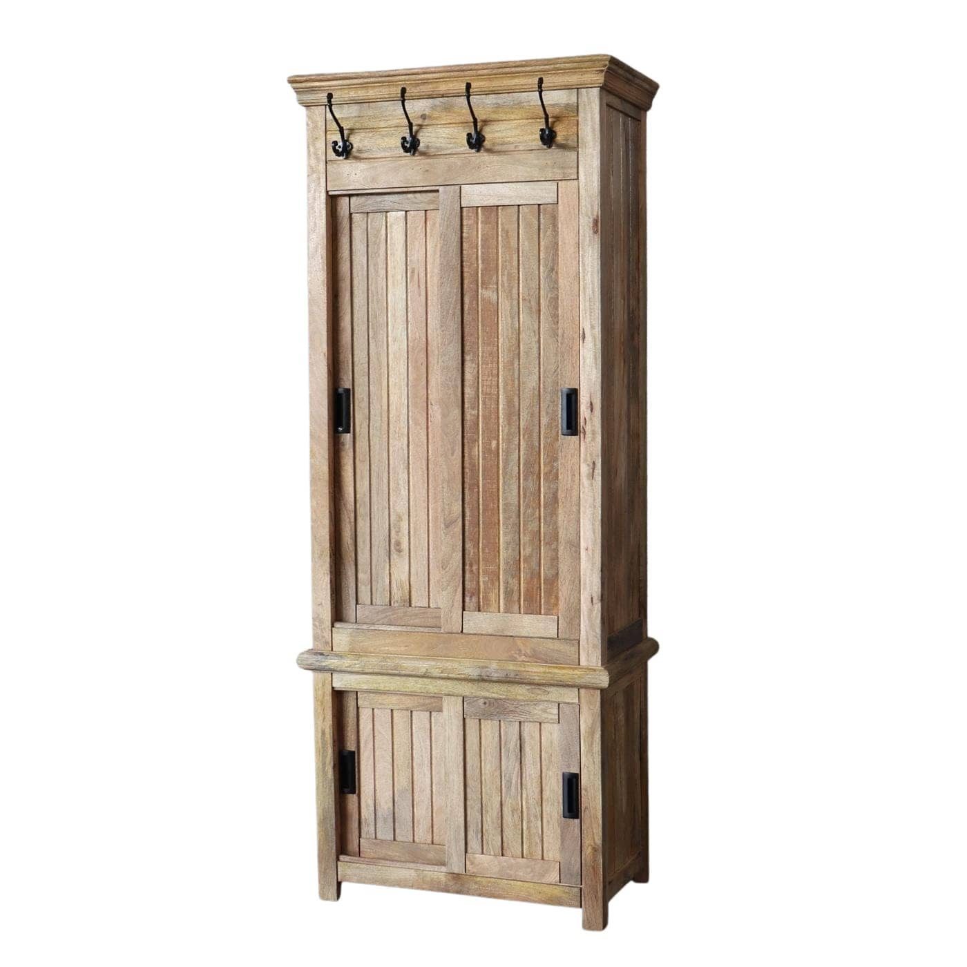 Liebhabern des Landhausstil werden hier die Herzen höher schlagen! Der edle Schuhschrank kann gleichzeitig als Garderobe genutzt werden. Edles, massives Mangoholz mit einer begeisternden Maserung sowie einem natürlichen Farbstil werden Sie täglich begeistern. Die leicht abgeschrägten Fächer bieten ausreichend Platz für edle Schuhe. Damit der Schrank auch in schmalen Räumen sein volles Potential entfalten kann sind Schiebetüren integriert. Traumhaft schöner Garderobenschrank der definitiv jede Einrichtung geschmackvoll bereichert.