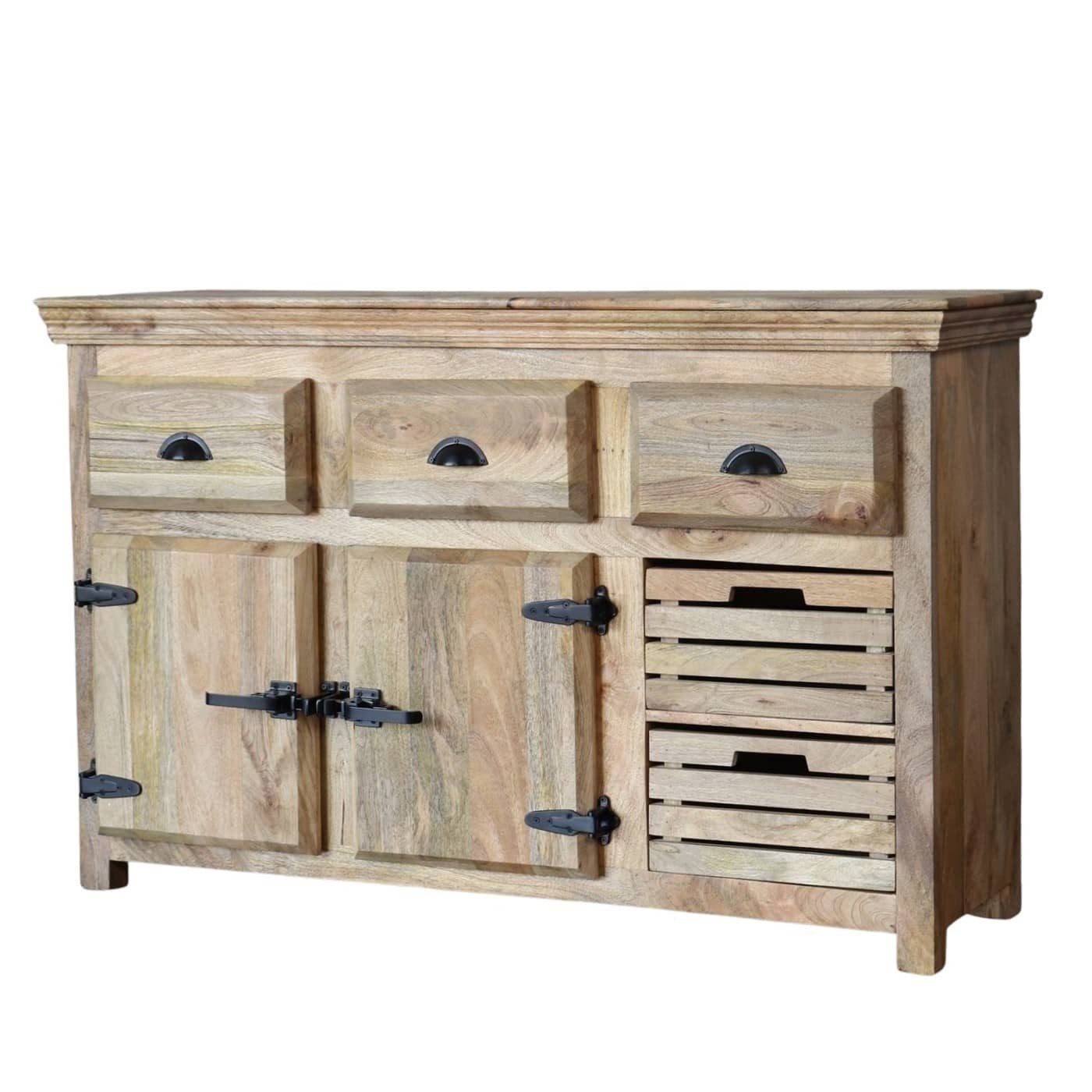 Ein Sideboard das zu Recht als Prachtstück im Vintage Stil bezeichnet werden kann ! In aufwendiger Handarbeit wurde dieser Kommode mit Schubladen und Körben aus massivem, naturbelassenem Mangoholz gefertigt. Ein Massivholzkommode die keine Wünsche offen lässt! Ausreichend Stauraum mit insgesamt 2 Türen, 3 Schubladen sowie 2 Korbschubladen. Das Platzangebot in all den unterschiedlichen Facetten wird sie begeistern. Auffallenden Designelemente sind die massiven Verschlüsse und Garniere aus Eisen. Sein stattliches Gewicht ist Zeuge der Massivbauweise in Handarbeit wie sie heute fast nicht mehr zu finden ist. Achten Sie bei dieser Anrichte auf sämtliche Details. Ein Prachtstück das über Generationen hinweg seine Liebhaber finden wird und somit für die Ewigkeit konzipiert wurde.