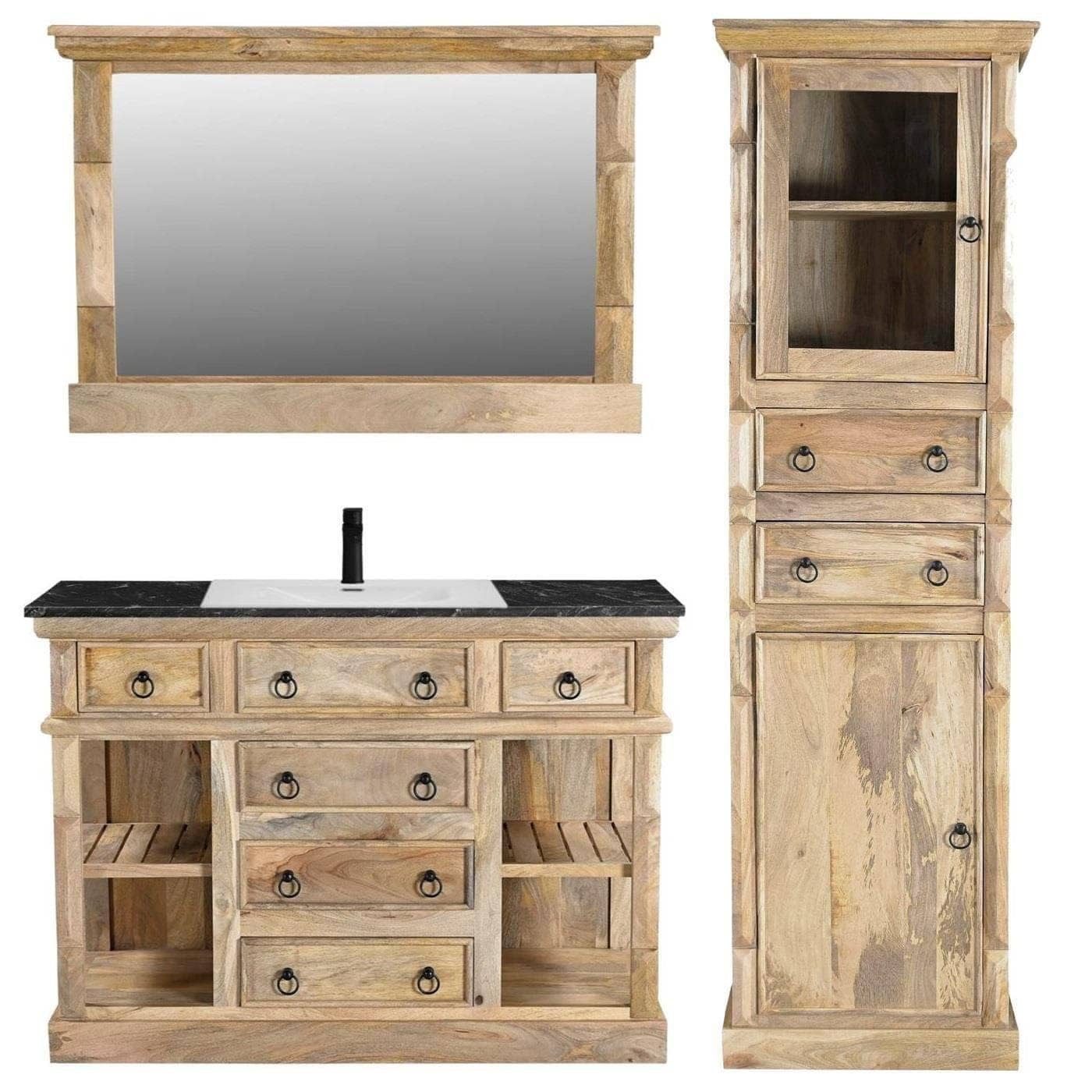 Der edle Waschtisch mit Unterschrank in sehr praktischen Abmessungen ist aus massiv edlem Mangoholz gefertigt und wirkt absolut faszinierend und elegant. Neben den offenen Regalfächern verfügt dieses prachtvolle Badmöbel über insgesamt vier Schubladen die ausreichend Platz für sämtliche Utensilien bieten. Die gelungene Handwerkskunst mit aufwendigen Schnitzereien und Verzierungen verleiht dem Design-Waschtisch seinen ganz besonderen Charme im Landhaus-Vintage-Design. Das edle Mangoholz ist relativ leicht aber besitzt eine ausgesprochen hohe Dichte. Möbel aus Mangoholz gelten deshalb als besonders langlebig und äußerst stabil und robust. Das Edelholz besitzt eine wunderschöne und einzigartige Maserung die seinen ganz besonderen Charakter besitzt und eine warme Atmosphäre ausstrahlt. Ein Möbelstück für die Ewigkeit da es definitiv auch bei nachfolgenden Generationen seine Liebhaber finden wird und zeitlos schön ist. Das Massivholz ist für den Einsatz im Badezimmer imprägniert und robust gegen Feuchtigkeit.