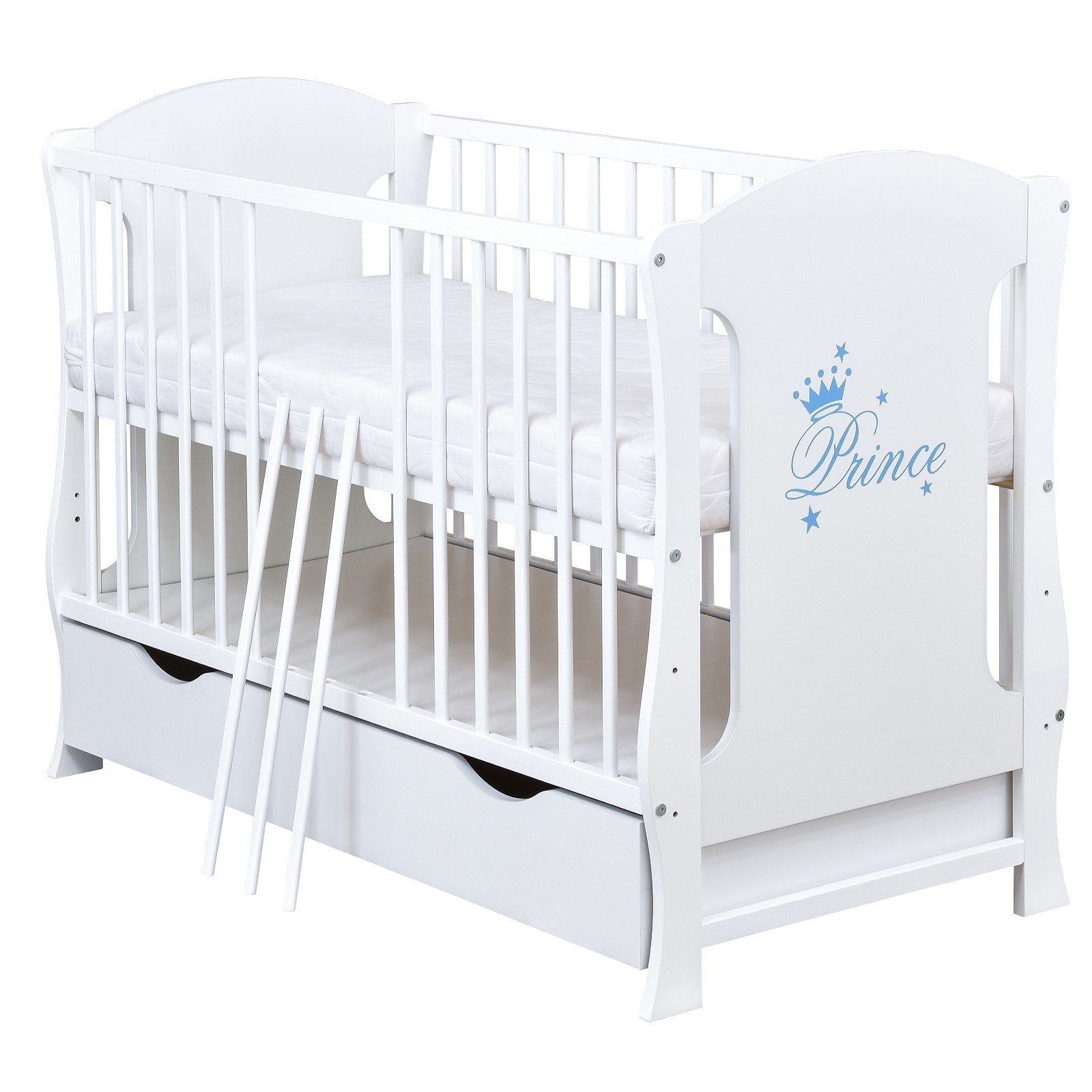 Das Babybett Prince besteht aus hochwertigem Massivholz und Möbelplatte, und sein raffiniertes Design mit runden Stäben verleiht ihm eine unverwechselbare Ästhetik. Die 3-fach höhenverstellbare Lattenrost (20, 36, 49cm) sorgt nicht nur für den optimalen Schlafkomfort Ihres Babys, sondern ermöglicht auch eine Anpassung an das Wachstum Ihres Kindes.