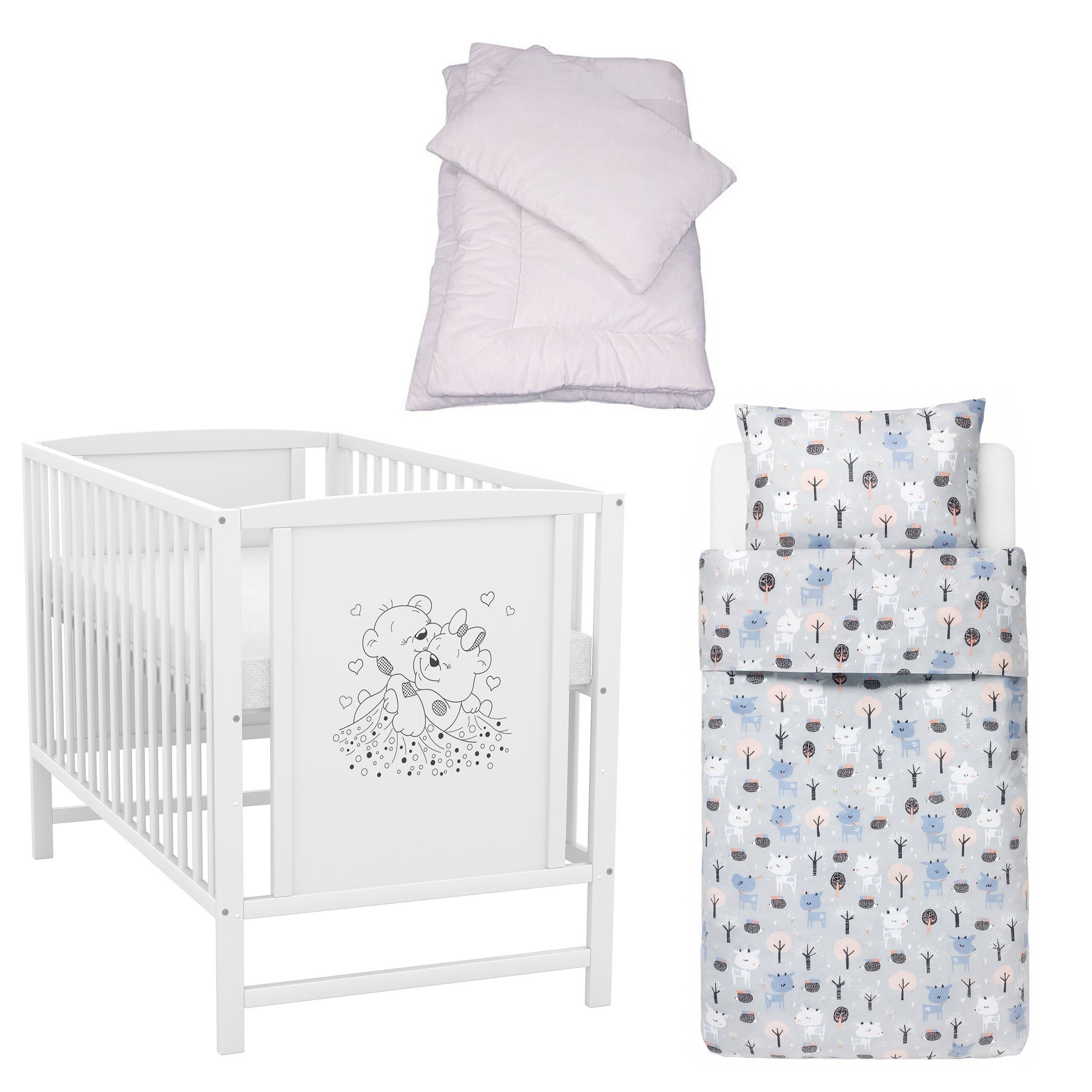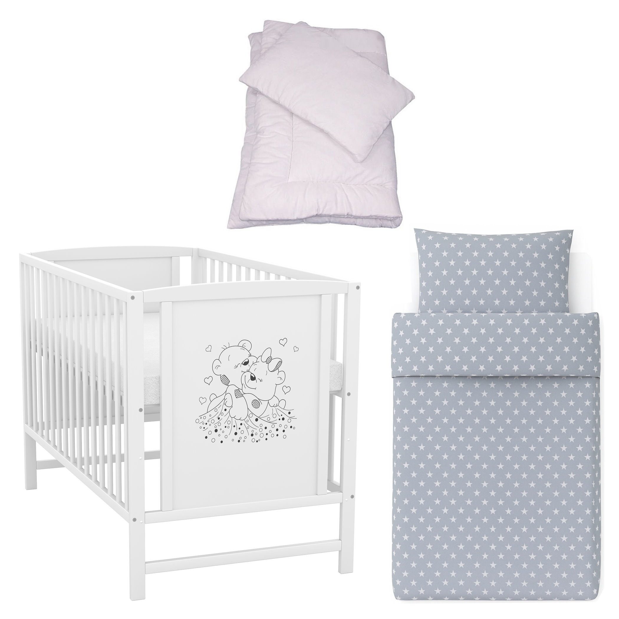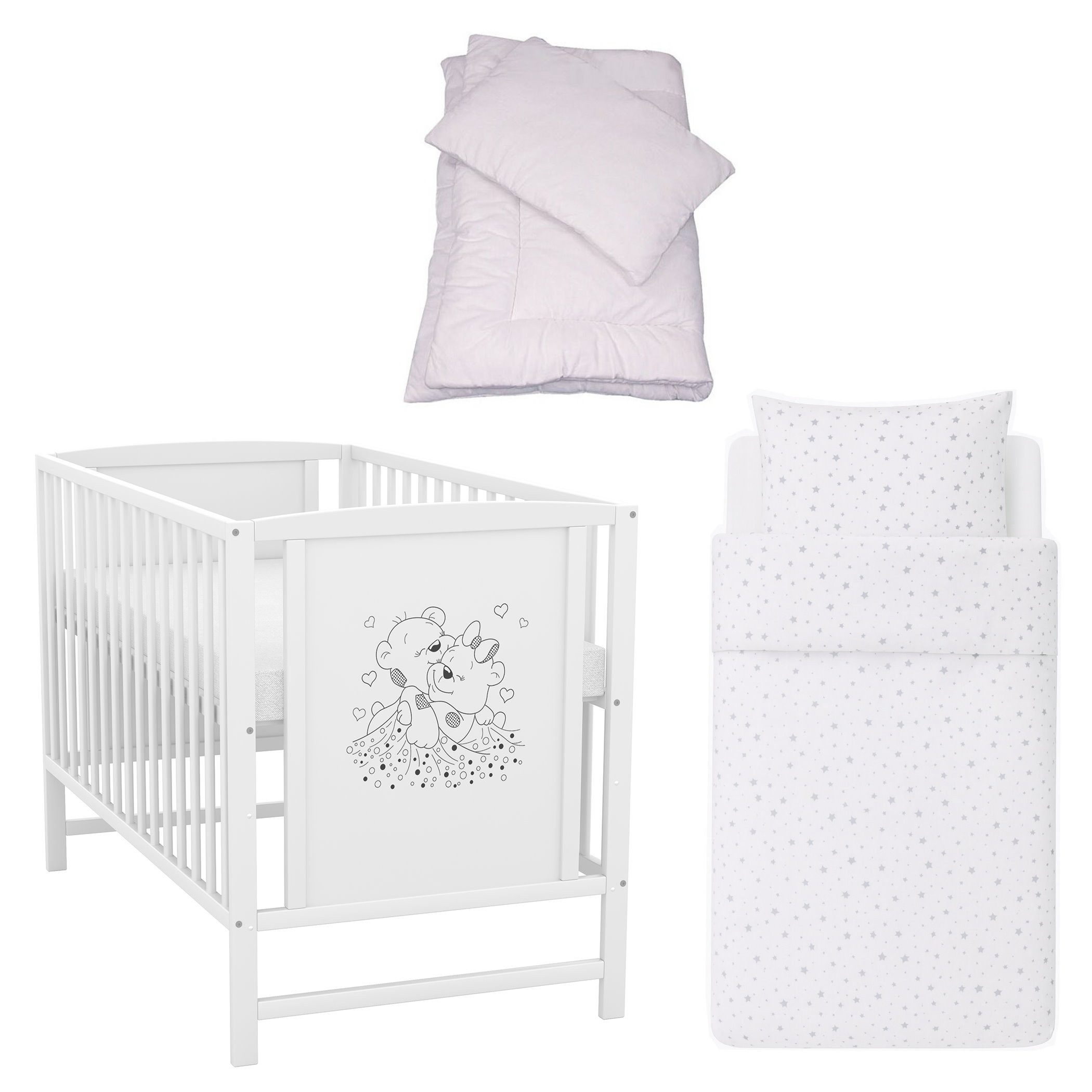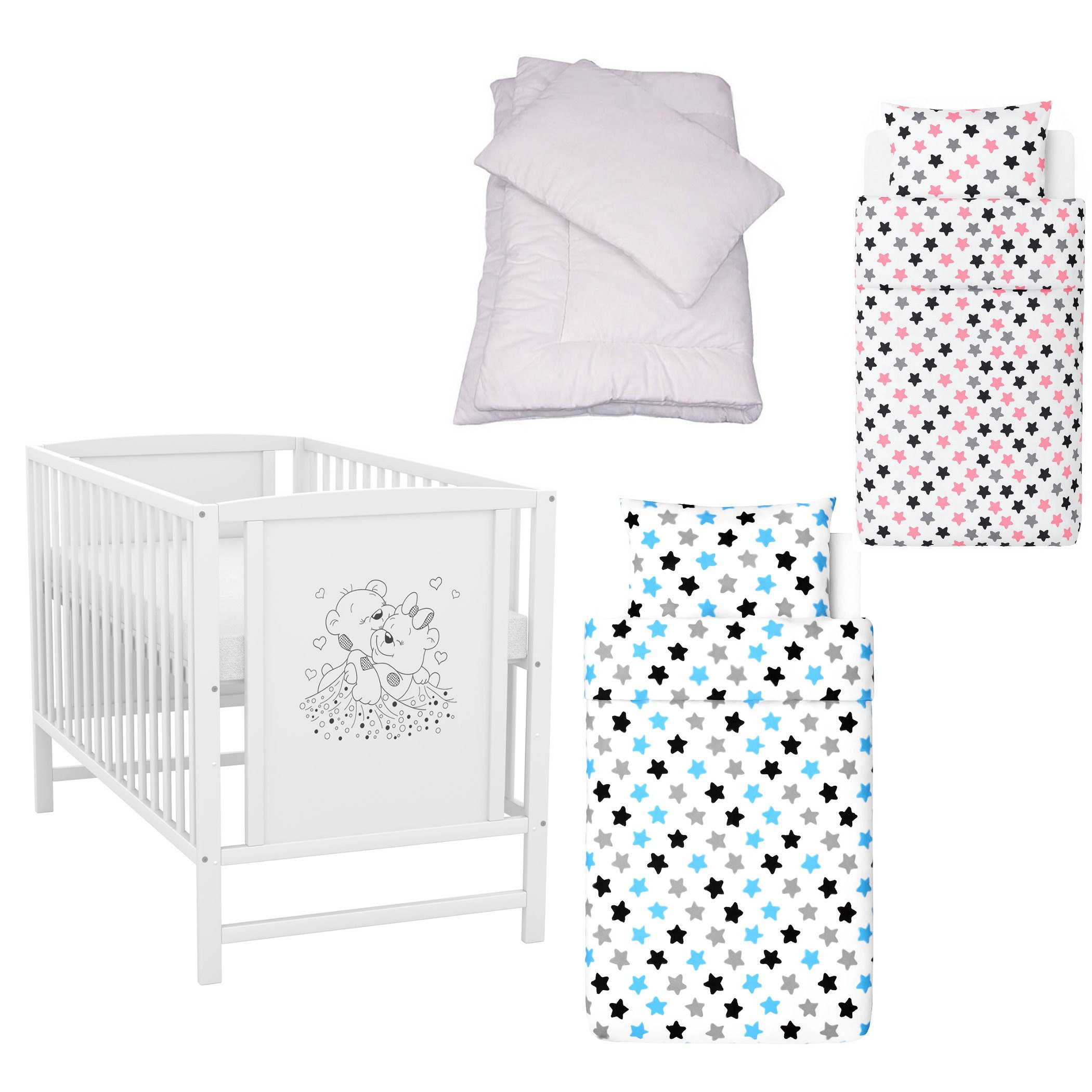 Das Babybett wird mit einer komfortablen Schaumstoffmatratze (120x60x6 cm) und einem 4-teiligen Bettwäsche-Set geliefert. Die Bettwäsche aus 100% Baumwolle ist weich, atmungsaktiv und bei 40°C waschbar, während der Matratzenbezug bei 40°C gereinigt werden kann.