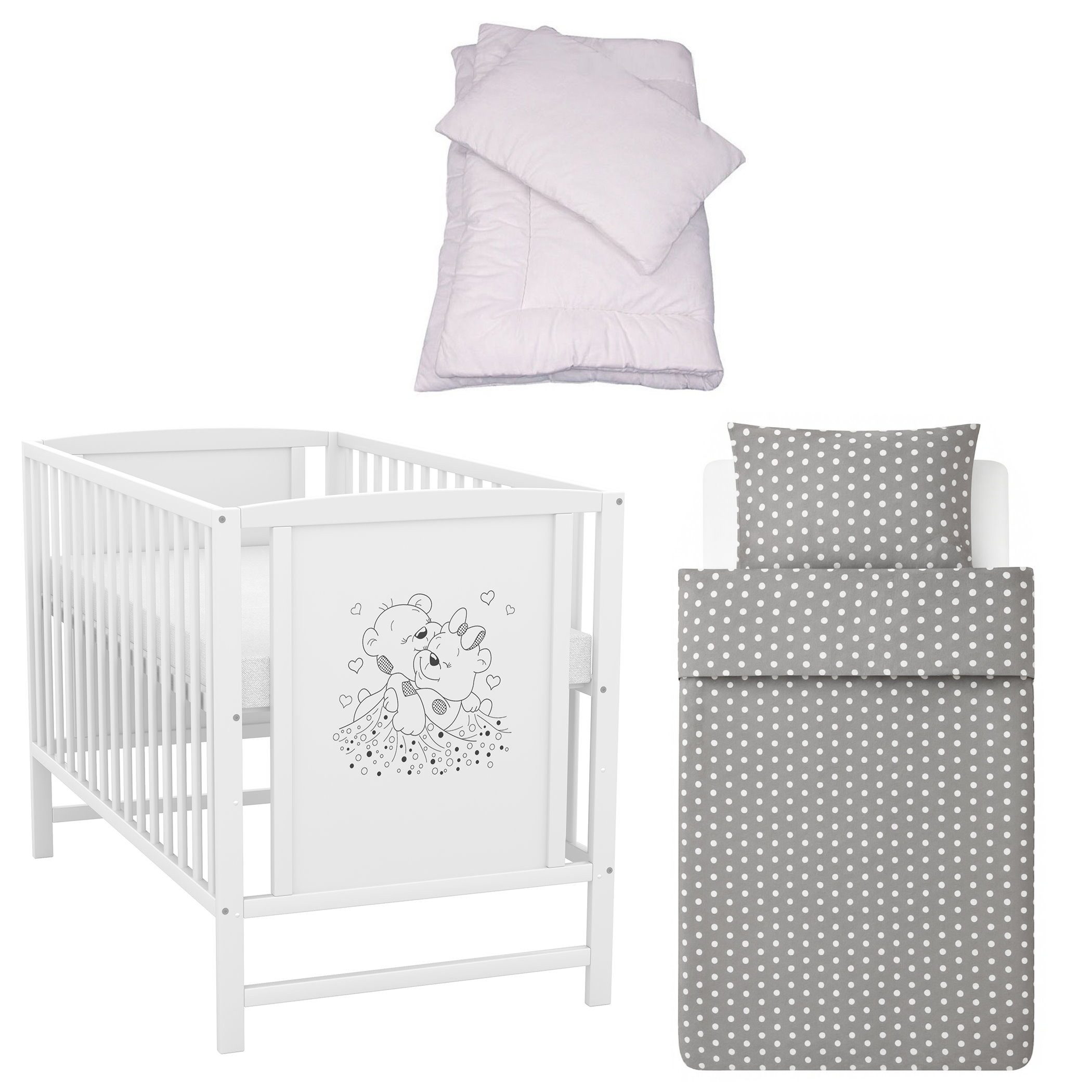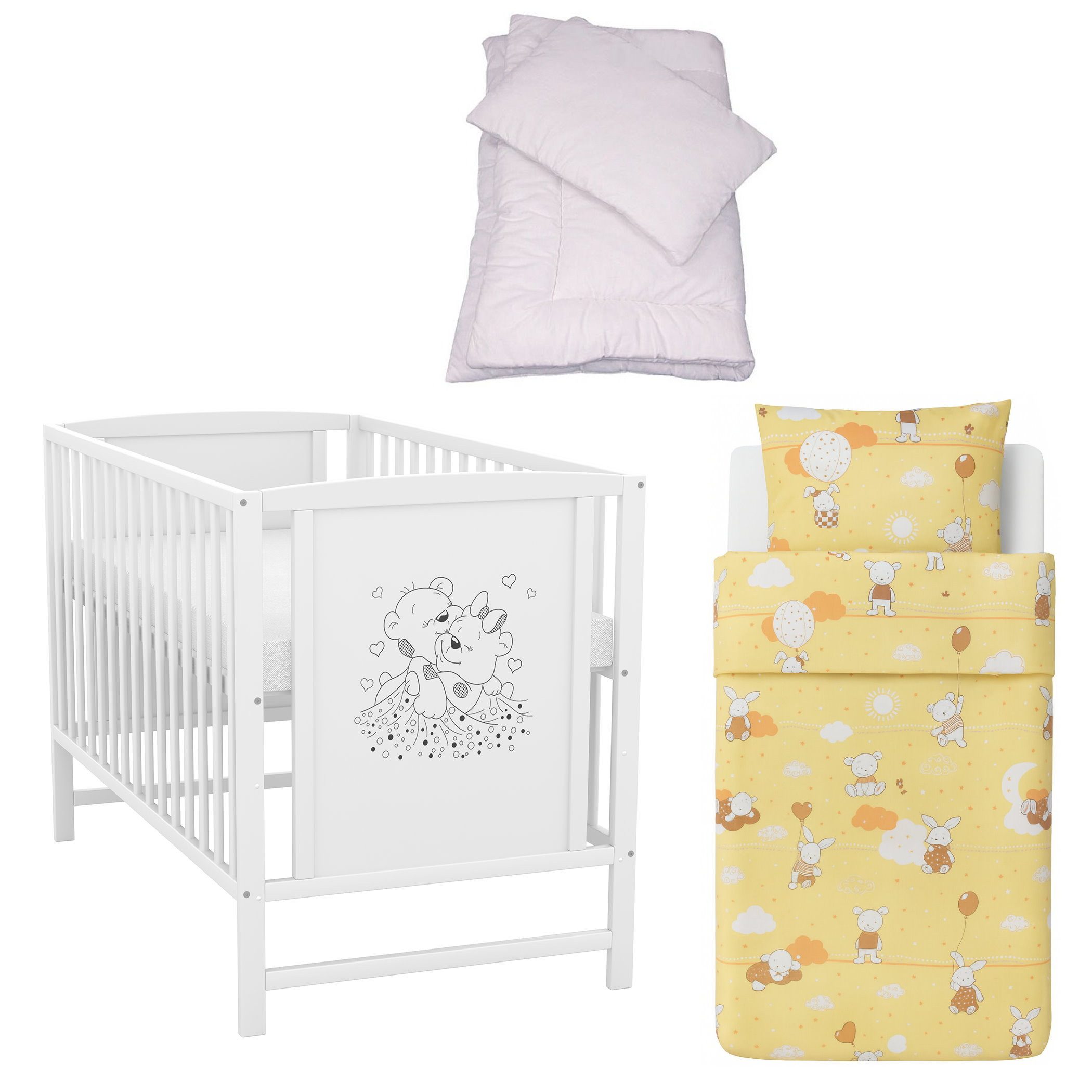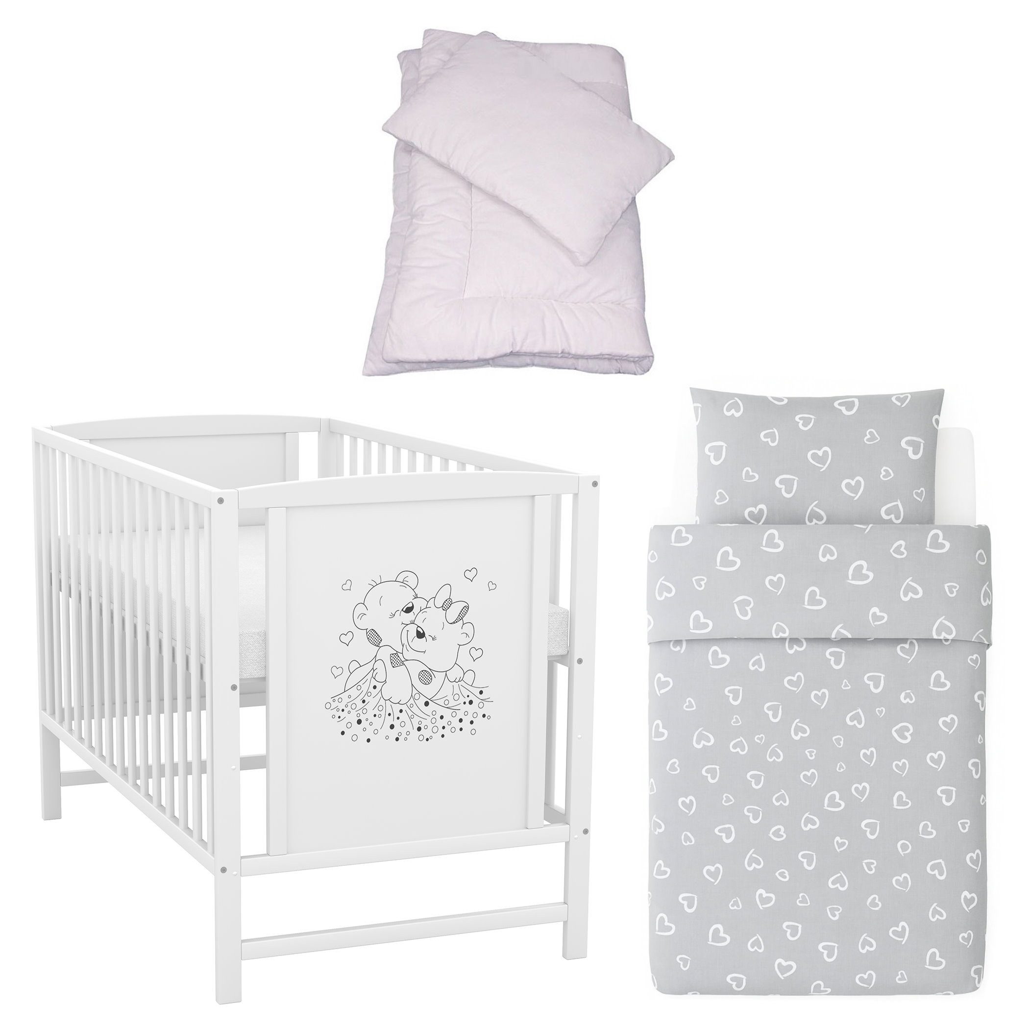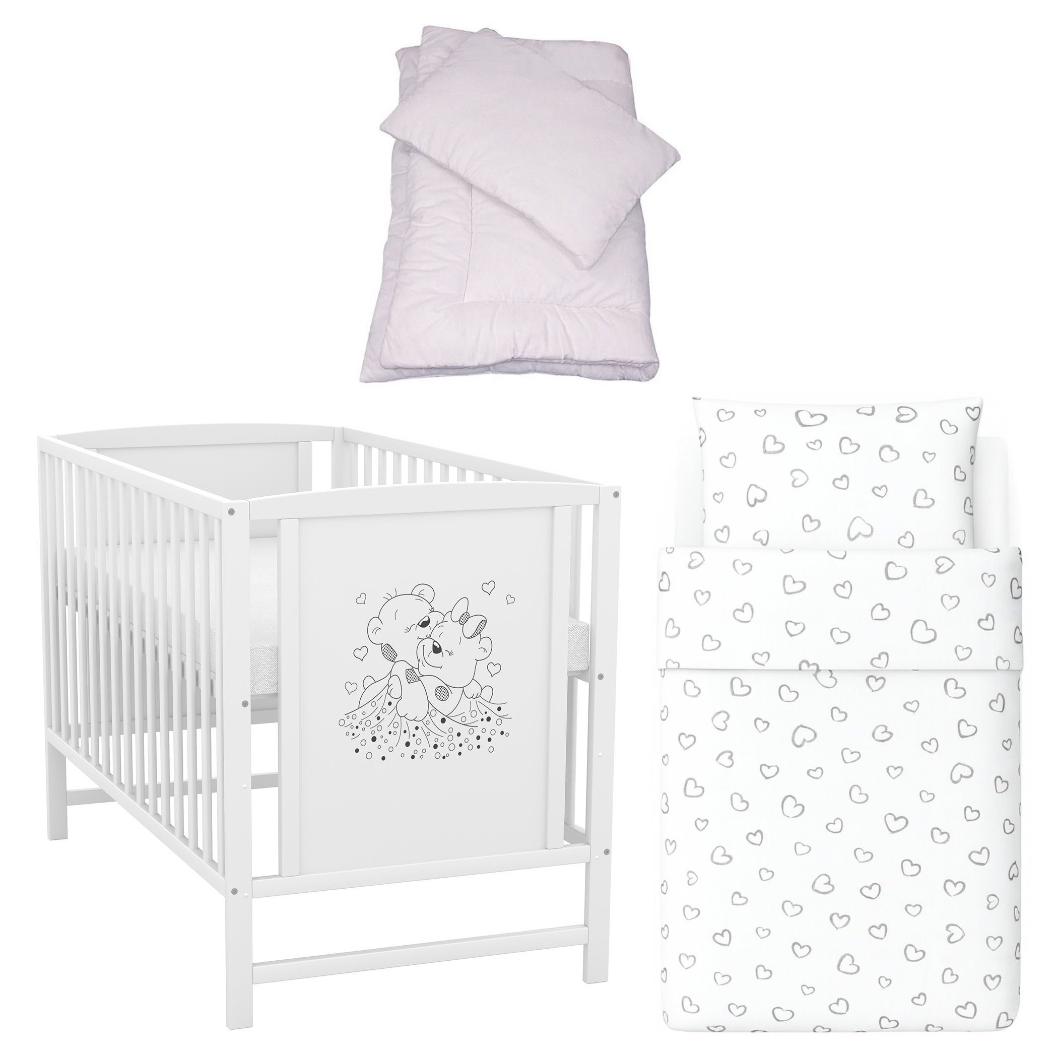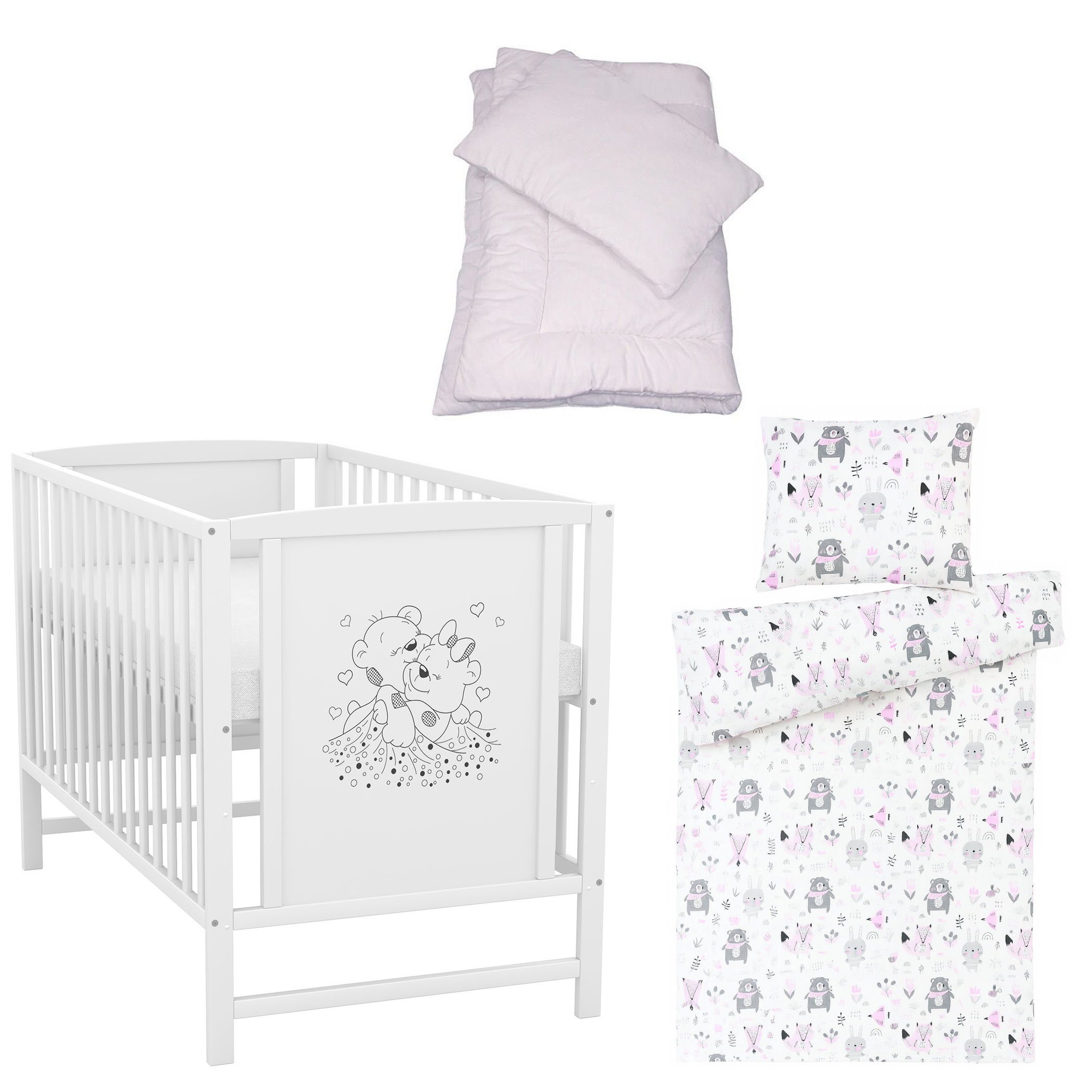 Das Babybett wird mit einer komfortablen Schaumstoffmatratze (120x60x6 cm) und einem 4-teiligen Bettwäsche-Set geliefert. Die Bettwäsche aus 100% Baumwolle ist weich, atmungsaktiv und bei 40°C waschbar, während der Matratzenbezug bei 40°C gereinigt werden kann.
