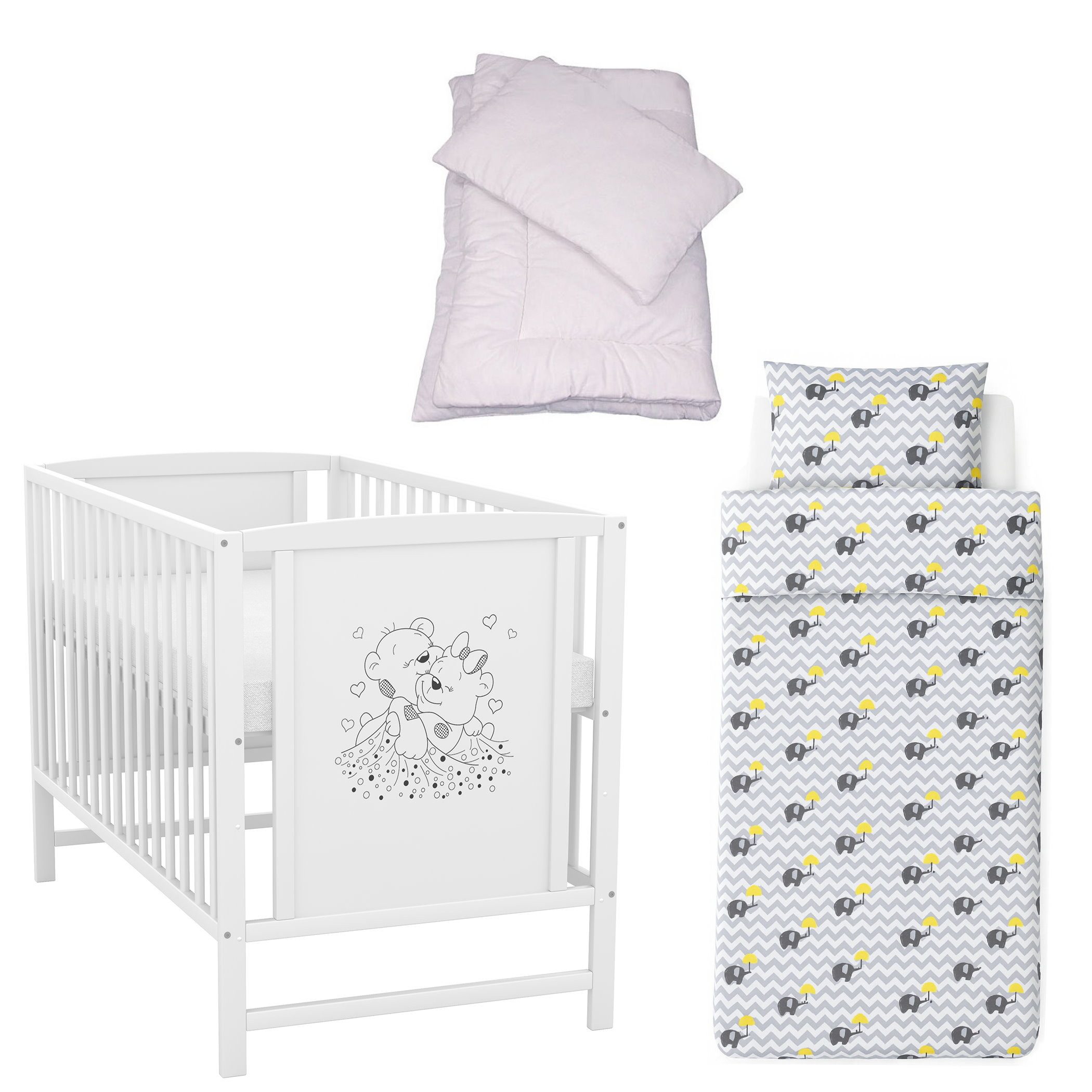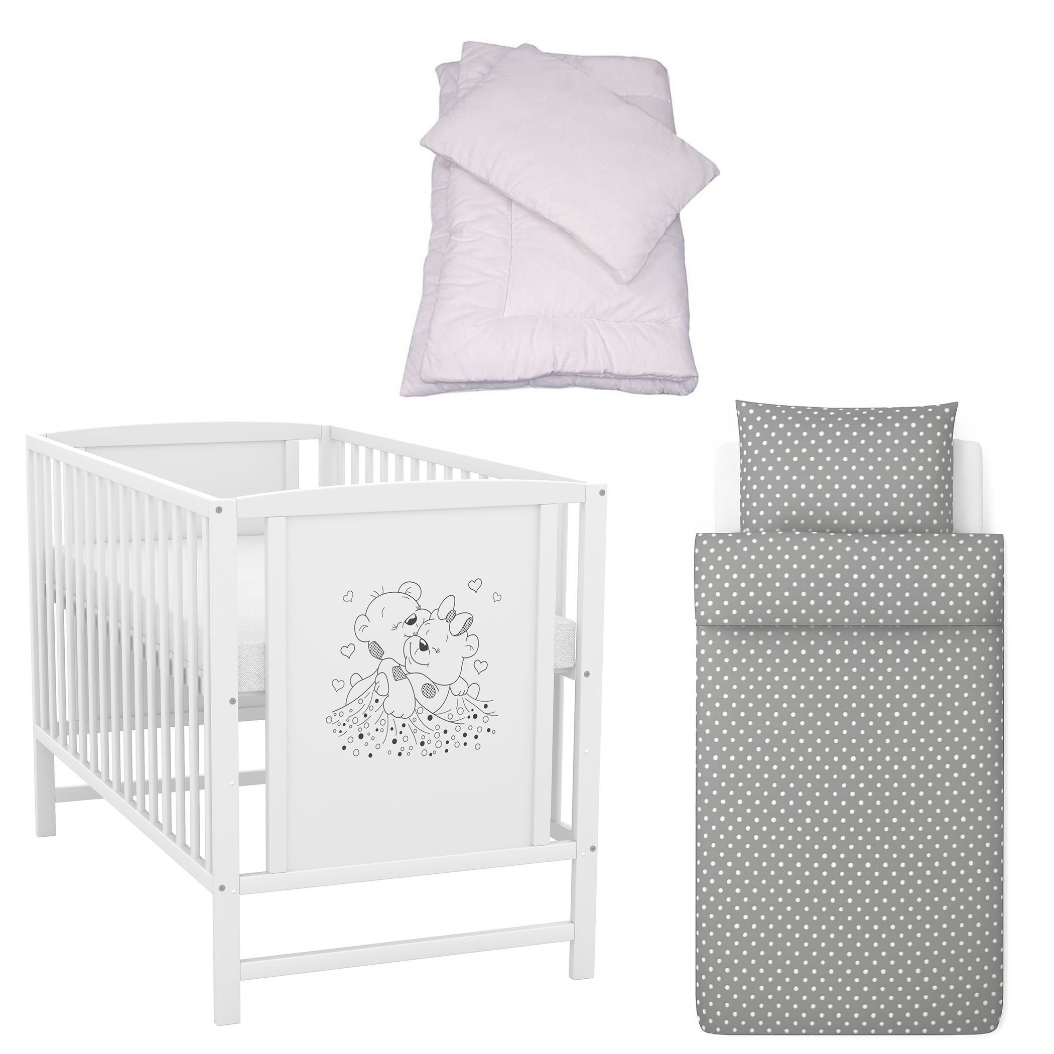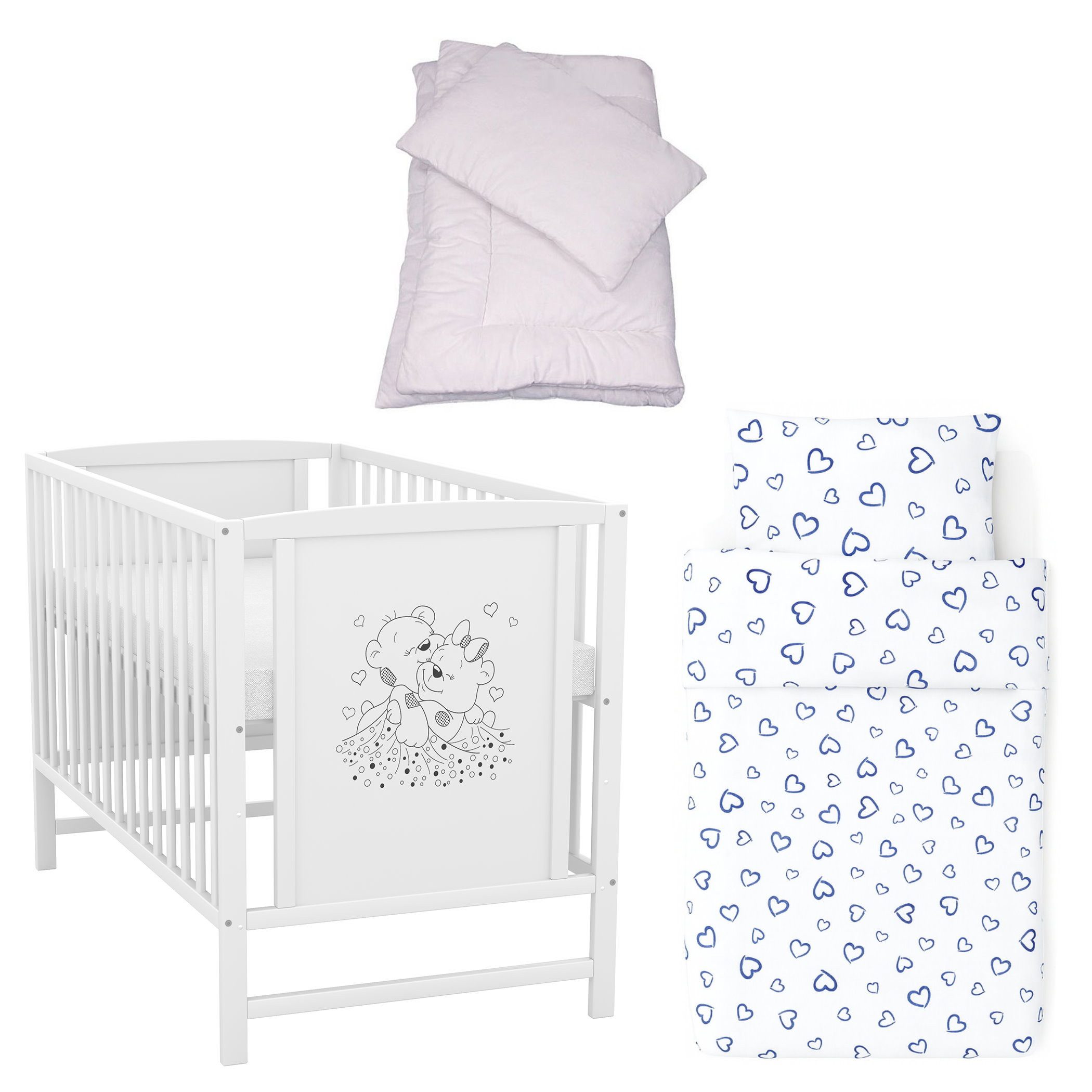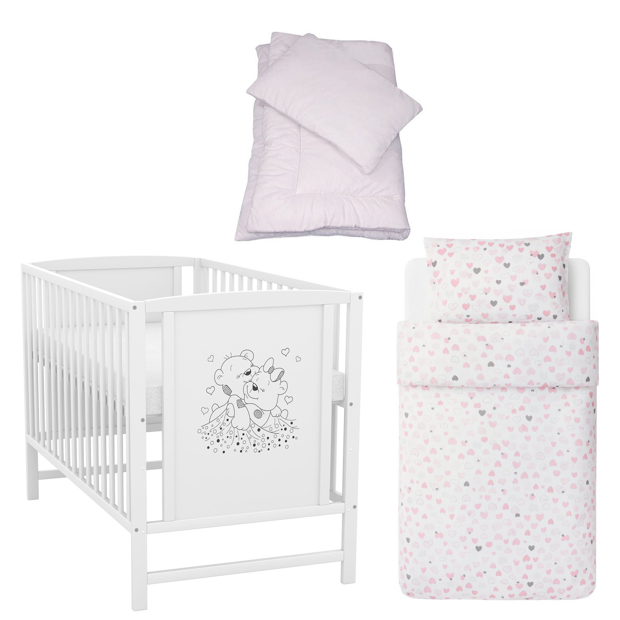 Das Babybett wird mit einer komfortablen Schaumstoffmatratze (120x60x6 cm) und einem 4-teiligen Bettwäsche-Set geliefert. Die Bettwäsche aus 100% Baumwolle ist weich, atmungsaktiv und bei 40°C waschbar, während der Matratzenbezug bei 40°C gereinigt werden kann.