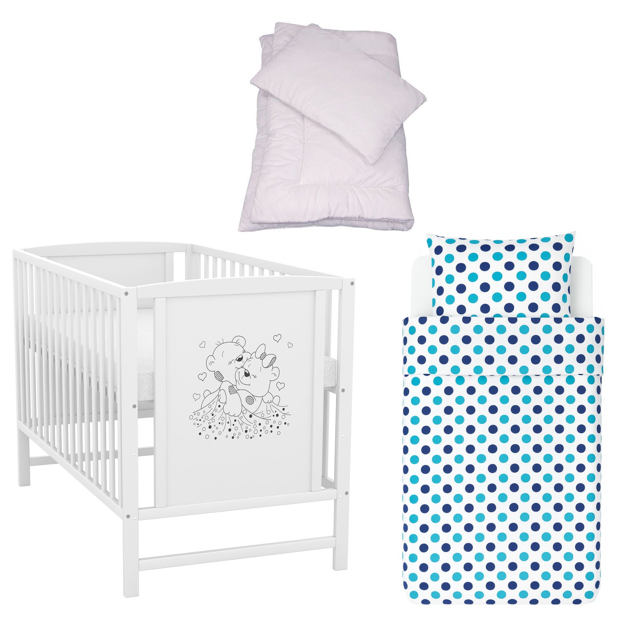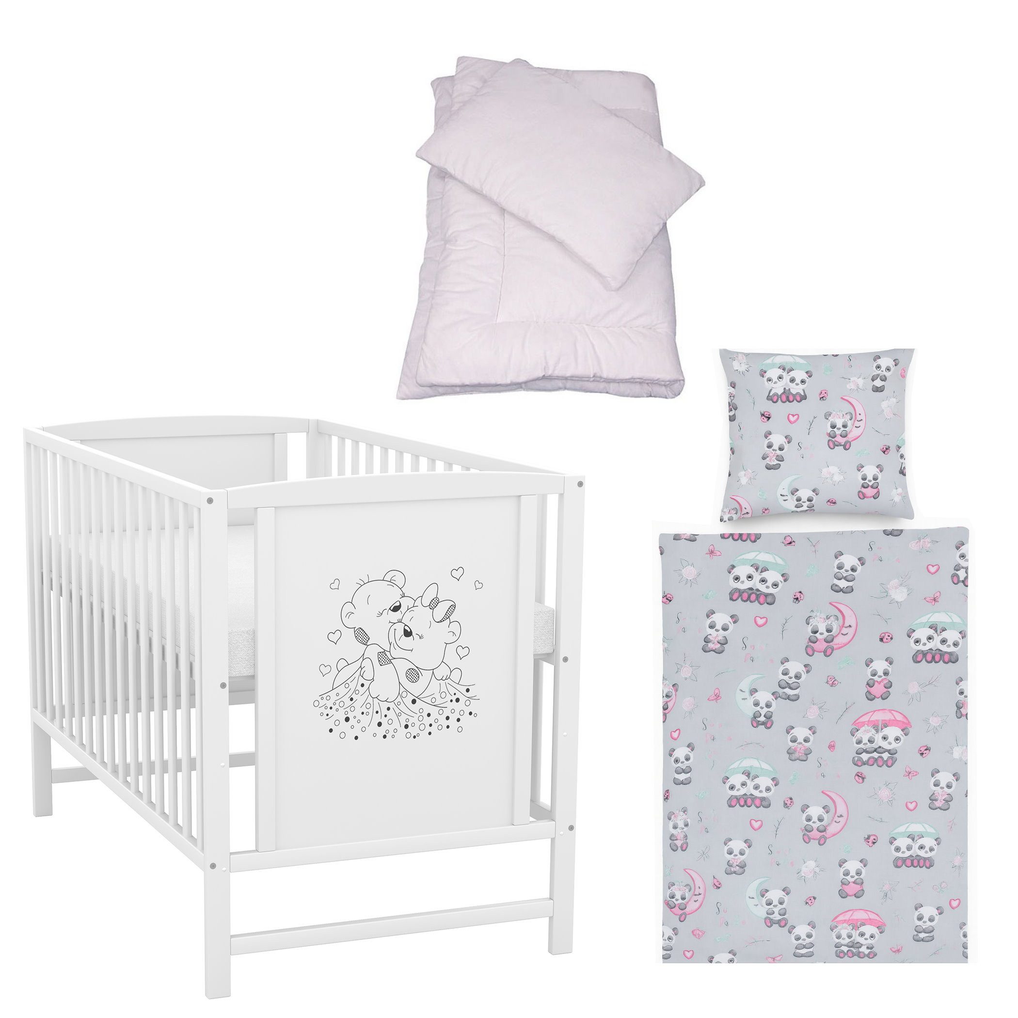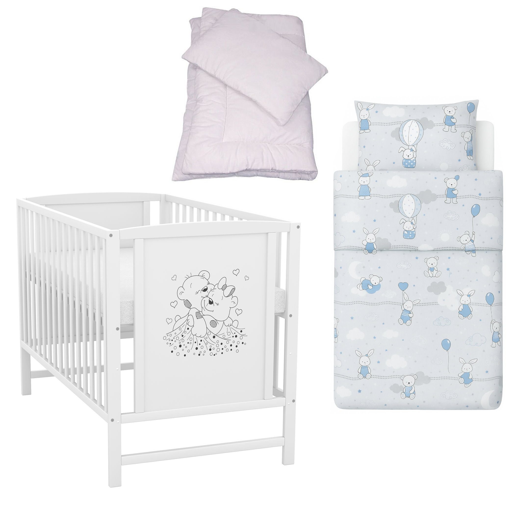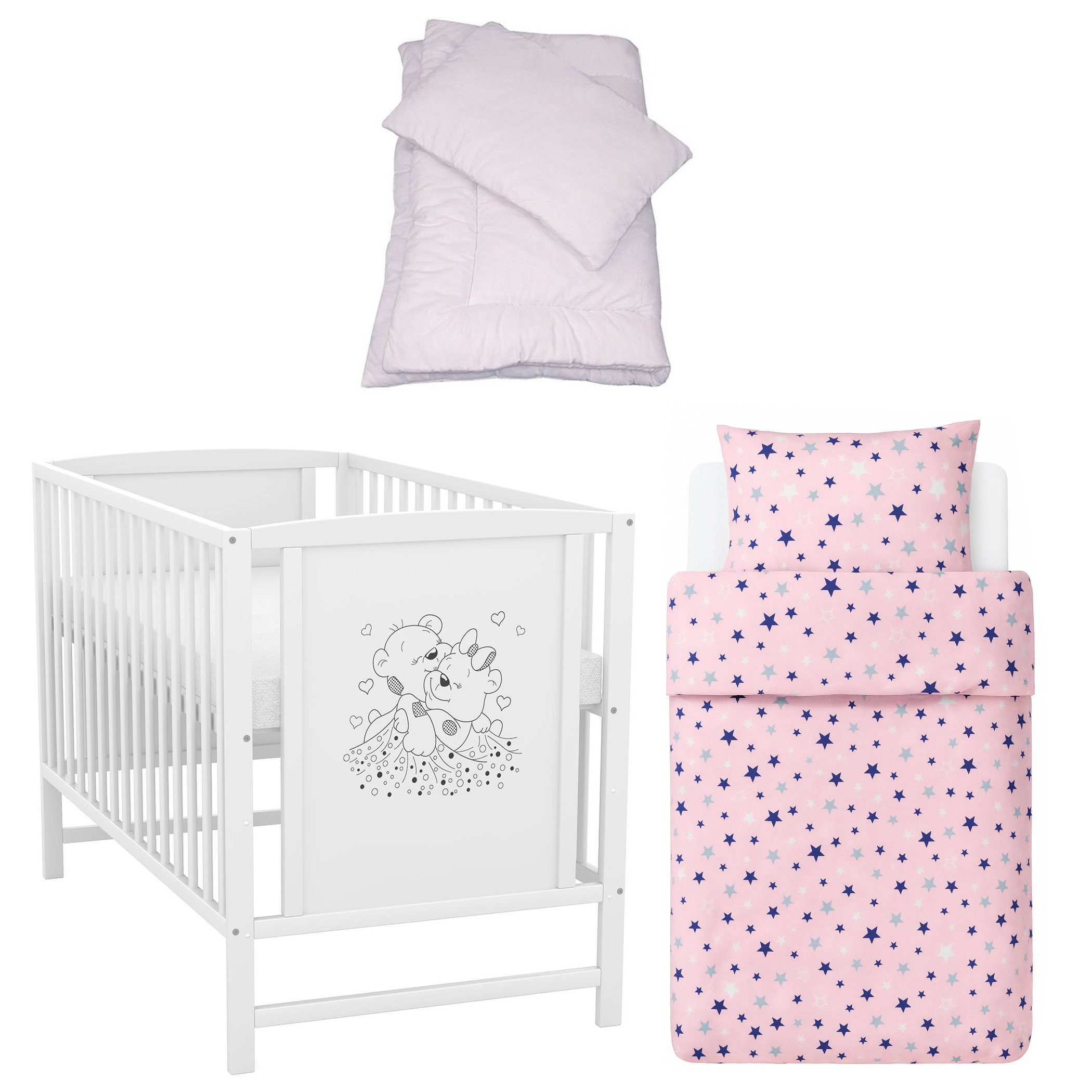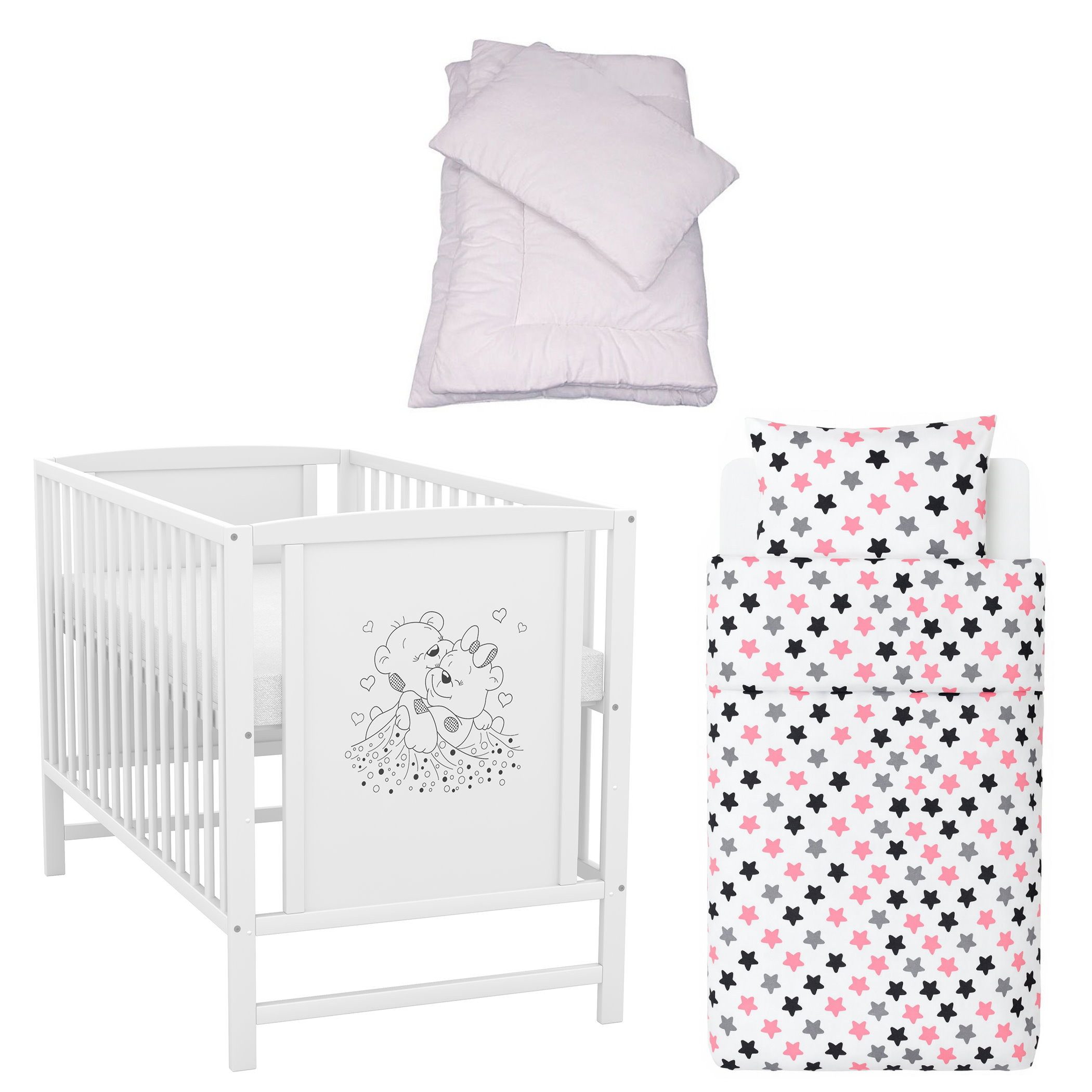 Das Babybett wird mit einer komfortablen Schaumstoffmatratze (120x60x6 cm) und einem 4-teiligen Bettwäsche-Set geliefert. Die Bettwäsche aus 100% Baumwolle ist weich, atmungsaktiv und bei 40°C waschbar, während der Matratzenbezug bei 40°C gereinigt werden kann.