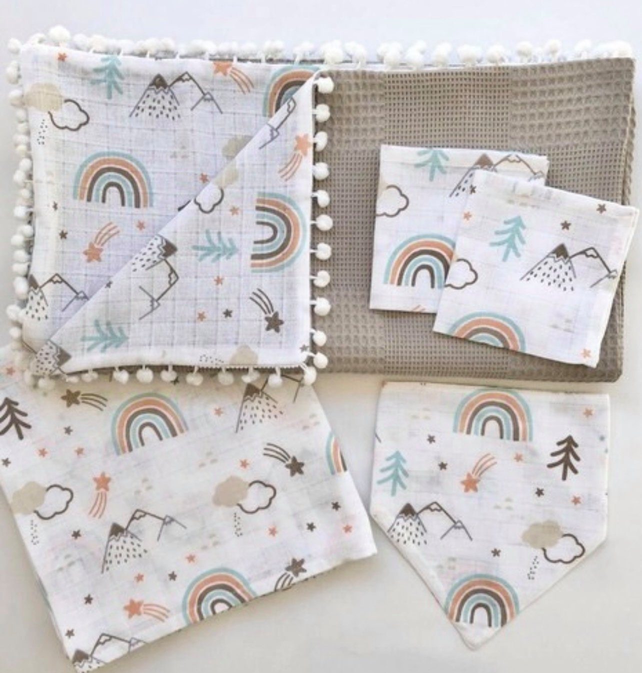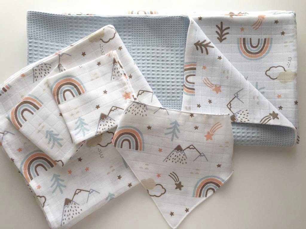Lieferumfang: 1x Wendedecke (ca. 100x100cm) 1x Mulltuch (ca. 110x110cm) 2x Spucktücher (ca. 27x27cm) 1x Halstuch GRATIS Unsere weiche & luftige Musellinstoffe sind aus 100% Baumwolle und laden dein Baby zum Kuscheln ein. Musselin ist besonders saugfähig, langlebig und atmungsaktiv und eignet sich von daher sehr gut für Babytextilien. Jedes einzelne Produkt wurde von uns mit viel Liebe und Sorgfalt handgefertigt, um deinem Baby das Beste anbieten zu können. Aus technischen Gründen sind leichte Farbabweichungen möglich. Die Maße sind ca. Maße und es können +/- 3cm Abweichungen vorkommen. Material und Maße: 100% Baumwollstoffe, antiallergen Pflegehinweise: bei 30Grad waschbar, Schonwaschmodus ohne Weichspüler Nicht trocknergeeignet Nicht bleichen