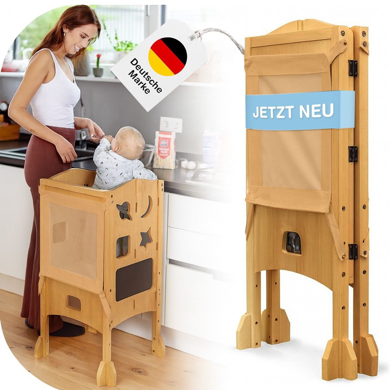 BabybeFun Lernturm ab 1 Jahr – Klappbar & Extra Sicher für Kinder von 1–5 Jahren Entdecke den BabybeFun Lernturm – dein täglicher Helfer, um dein Kind sicher und spielerisch in die Küchenaktivitäten einzubeziehen. Der hochwertige Montessori-Lernturm wurde speziell für Kinder von 1 bis 5 Jahren entwickelt und bietet durch sein 360° Sicherheitsnetz optimalen Schutz. Ob beim Zähneputzen, Kochen oder Backen – dein Kind ist sicher dabei und kann eigenständig die Welt entdecken. Dank der zusammenklappbaren Konstruktion ist der Lernturm besonders platzsparend und innerhalb von nur 10 Minuten einsatzbereit – ideal für jede Küche. Das massive Holz und der Anti-Kipp-Schutz sorgen für höchste Stabilität, selbst bei wilderem Toben. Zusätzlich verhindern Anti-Rutsch-Streifen ein Verrutschen auf glatten Böden. Im Gegensatz zu herkömmlichen Lerntürmen schützt das umlaufende Netz zuverlässig vor dem Herausrutschen. So ist dein Kind rundum gesichert und kann mit Freude und Vertrauen neue Fähigkeiten erlernen. Produktdetails: Maße: 94 x 53 x 50 cm Farbe: Weiß Material: Massives Holz Besonderheiten: 360° Sicherheitsnetz, klappbar, Anti-Kipp-System Altersempfehlung: 1–5 Jahre Einfach, sicher, flexibel: Der BabybeFun Lernturm vereint Sicherheit, Funktionalität und Design – für unvergessliche gemeinsame Momente in Küche & Bad. Solltest du nicht zufrieden sein, bietet BabybeFun eine Geld-zurück-Garantie. Schenke deinem Kind Freiheit und Geborgenheit in einem – mit dem BabybeFun Lernturm.