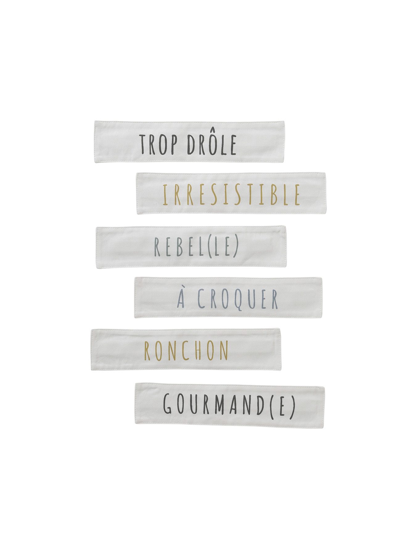 Oberseite bedruckt Unterseite uni Pompons an den Ecken Wimpel-Applikationen Ring zum Markieren von Babys Alter für das Foto Mess-Skala mit Pfeil zum Markieren von Babys Größe 6 Klett-Applikationen zum Verzieren: Je suis... trop drôle - Ich bin so witzig Je suis... irresistible - Ich bin unwiderstehlich Je suis... rebel(le) - Ich bin ein(e) Rebell(in) Je suis... à croquer - Ich bin zum Verlieben Je suis... ronchon - Ich bin mürrisch Je suis... gourmand(e) - Ich bin gefräßig (eine Naschkatze)