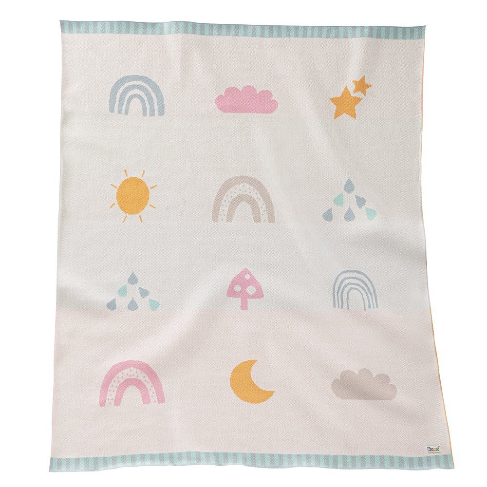 Schöne howa Babydecke "be happy" in der Размер 80 x 100cm mit niedlichem Design Diese tolle, gestrickte Babydecke "be happy" von howa ist aus hochwertiger, 100% Baumwolle. Das feine Strickmuster macht die howa Kuscheldecke für Babys weich und robust zugleich. Sie hat ein wunderschönes Design. An den beiden kurzen Seiten ist ein schöner Rand aus türkis und blau. Die großen, auffälligen Verzierungen mit Regenbogen, Wolke, Sonne, Mond und Sterne in den Farben rosa, orange, türkis, taupe und blau auf der Vorderseite sind ein schöner Blickfang. Auf der Rückseite ist unsere Babydecke "be happy" im ruhigen Braun-, Grün und Blauton gehalten, somit ist sie als Wendedecke benutzbar. howa Baumwolldecke Strickdecke "be happy" - Geborgenheit und Wärme für Ihr Baby & Kleinkind Die howa Strickdecke wird Ihrem Baby Geborgenheit und Wärme schenken. Ob im Schlafzimmer oder als Begleiter im Kinderwagen oder bei Autofahrten, sie kann überall dafür Sorge tragen, dass Ihrem Baby wohlig warm ist. Ihr Baby wird unsere howa gestrickte Baumwolldecke lieben! Details: 80x100 cm, 100% Baumwolle, gestrickt, waschbar, Vorderseite: beige mit sanften Farbverlauf, mit bunten Motiven (Regenbogen, Wolke, Sterne, Sonne, Regen, Mond etc.), Rückseite: im zarten, ruhigen Braun-, Grün und Blauton