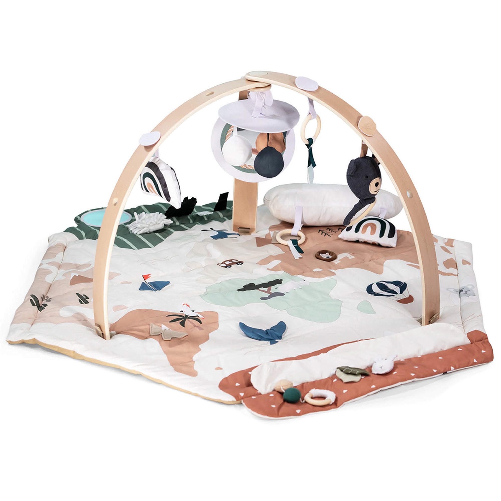 | Lieferumfang | 5 Spielzeuge, Holzspielbogen, Liegekissen, Spielmatte |