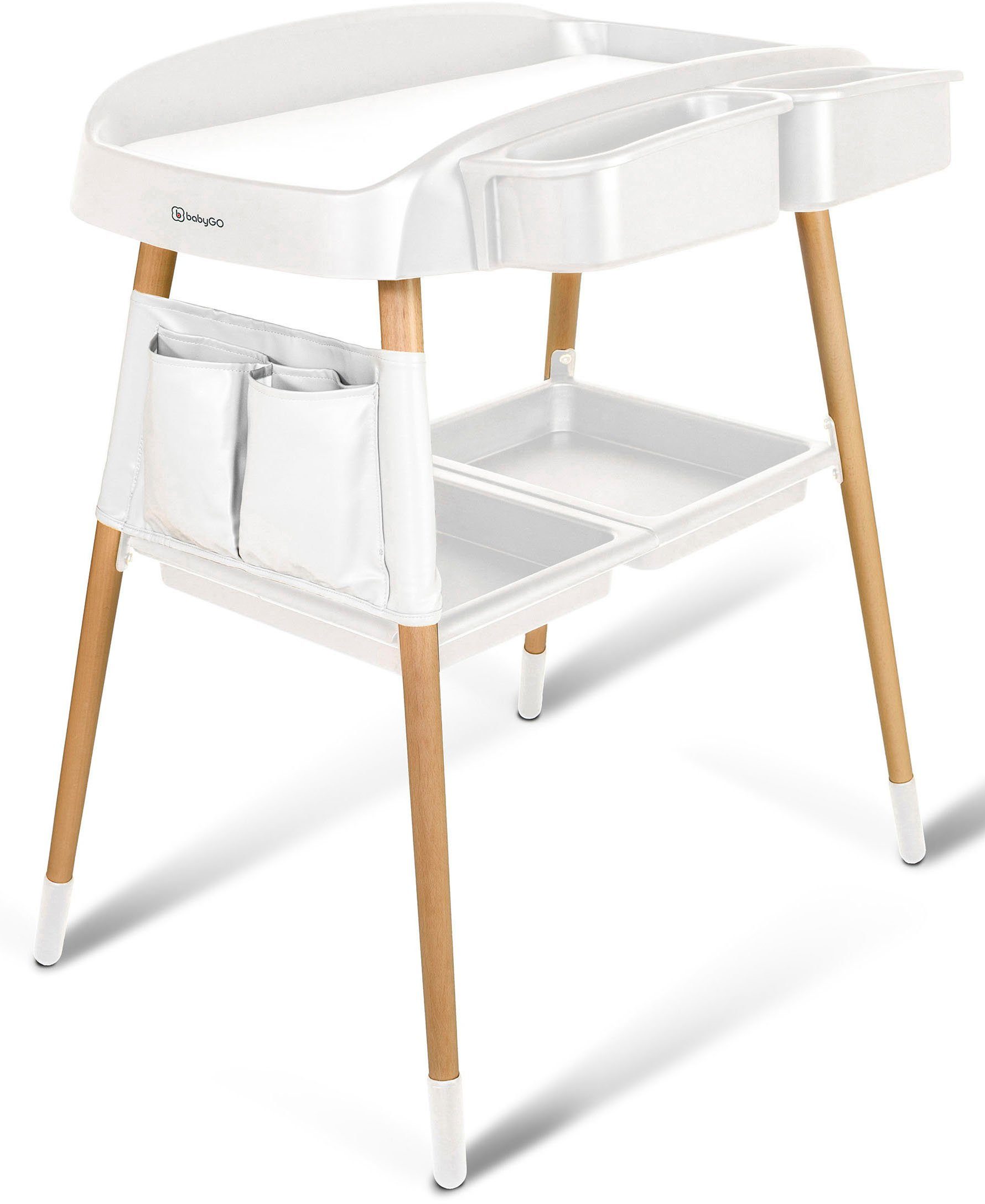 babygo "ChangeMe, weiß" Wickeltisch - Einfachheit trifft auf Funktion mit dem neuen babyGO. Dieses raffinierte Design bietet Müttern und Vätern nicht nur eine zuverlässige Wickelstation, sondern auch stilvolle Ästhetik, die in jedes moderne Zuhause passt. Mobilität und Stil: Der Wickeltisch, hergestellt aus dem exquisitesten Buchenholz, ist ein Ausdruck höchster Eleganz. Er ist so konzipiert, dass er sich nahtlos in moderne Innenräume einfügt und eine zeitlose Ästhetik bietet. Die besonders stabilen und langlebigen Räder ermöglichen eine einfache Handhabung und Bewegung des Tisches. Egal, in welchem Raum Sie sich gerade befinden, mit diesem Wickeltisch haben Sie immer und überall eine zuverlässige und stilvolle Wickelstation mit Wickelauflage parat. Seitliche Ablage: In der hektischen Zeit der Babybetreuung ist es unerlässlich, alles Notwendige schnell und einfach zur Hand zu haben. Aus diesem Grund verfügt unser Wickeltisch über eine besonders geräumige und praktische seitliche Ablage. Diese bietet genügend Platz für alle Wickelutensilien - von Windeln und Feuchttüchern bis hin zu Cremes und Pudern - und kann auch ideal als Wassergefäß für das Wickeln und Reinigen Ihres Babys genutzt werden. Durch diese multifunktionale Nutzung ist alles organisiert und leicht zugänglich, sodass Sie sich voll und ganz auf die Pflege Ihres Babys konzentrieren können. Zusätzliche Ablagefläche: Unterhalb des Hauptwickelbereichs haben wir eine zusätzliche Ablagefläche integriert. Diese eignet sich hervorragend für Ersatzkleidung, sodass Sie bei kleinen Unfällen schnell reagieren können. Zudem können Sie hier auch Spielzeug aufbewahren, um Ihr Baby während des Wickelvorgangs zu beschäftigen und abzulenken. Diese durchdachte Funktion ermöglicht es, den Wickelprozess für Sie und Ihr Baby so angenehm und stressfrei wie möglich zu gestalten. Seitentasche für Schnellzugriff: Wir haben eine Seitentasche entwickelt, die speziell dafür konzipiert ist, Windeln und Feuchttücher sofort griffbereit zu haben. Durch ihre strategische Platzierung und Gestaltung können Eltern mit nur einem Handgriff das Notwendige erreichen, wodurch der Wickelprozess erheblich erleichtert wird. Nie wieder unnötiges Suchen - mit dieser Tasche haben Sie alles Wichtige stets an Ort und Stelle. Lieferung erfolgt ohne Dekoration.