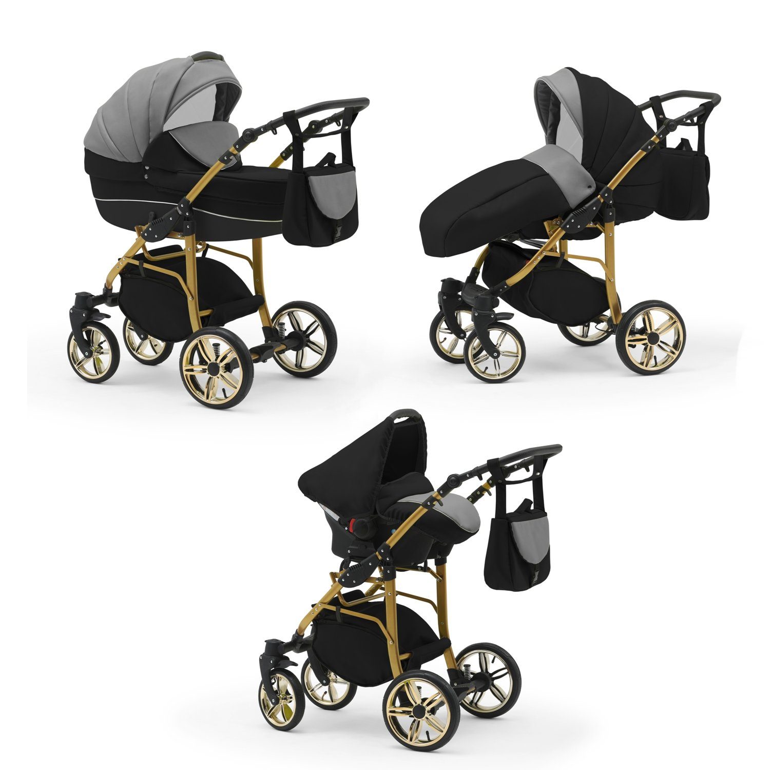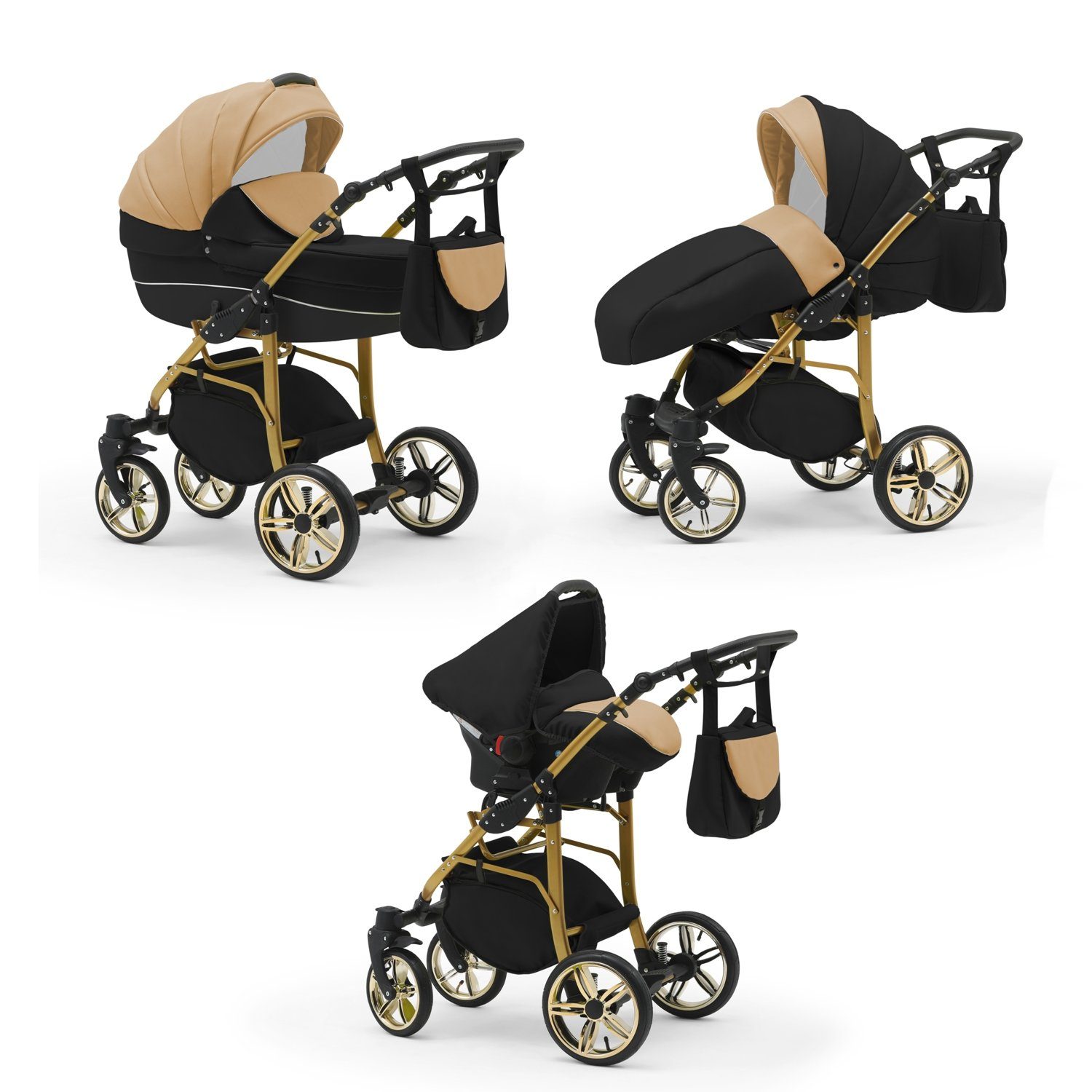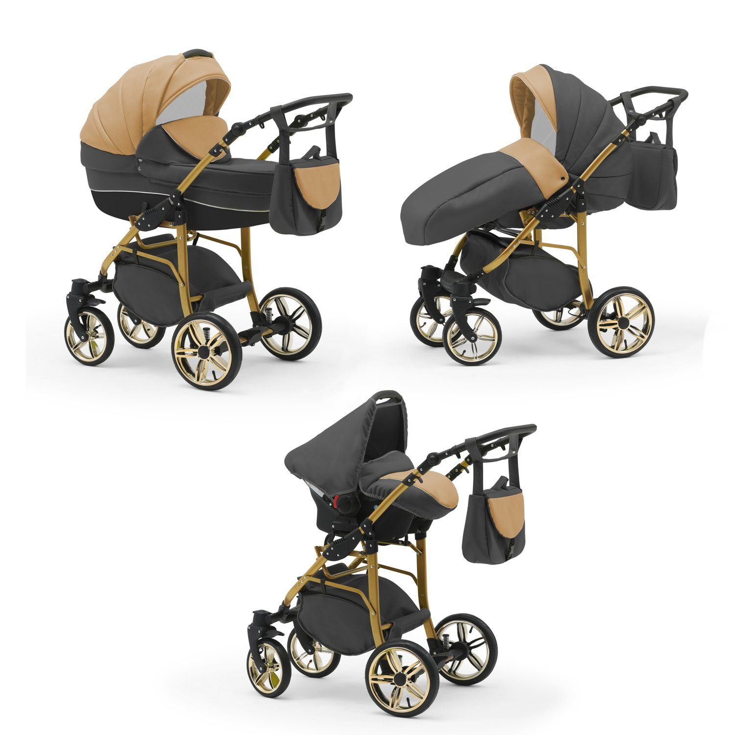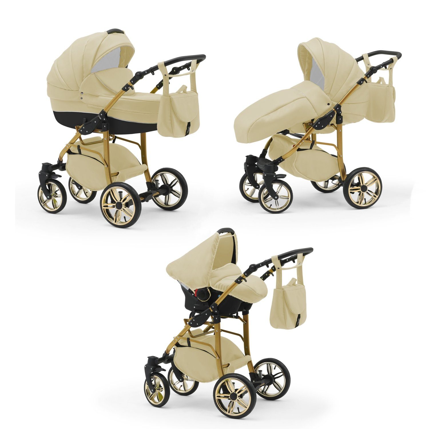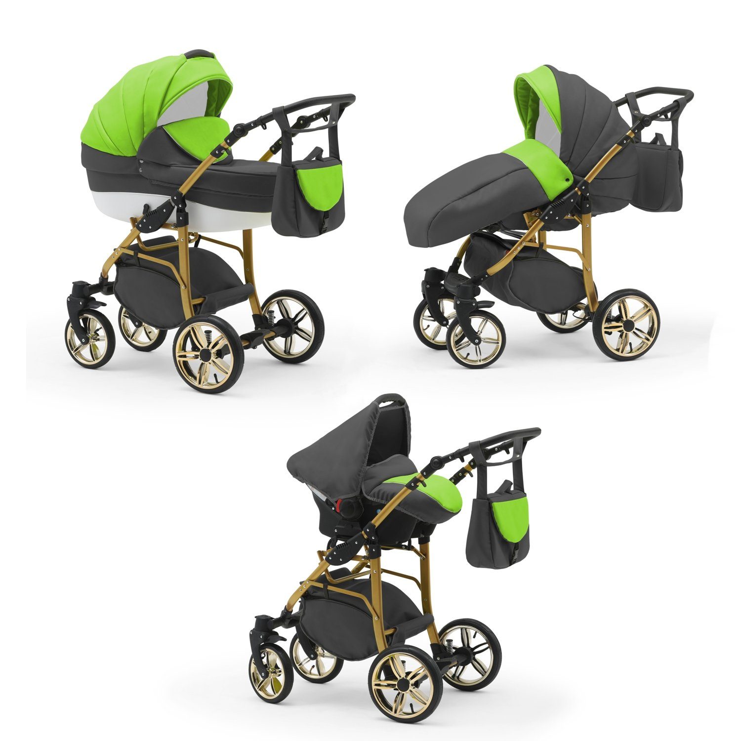 IHR SORGLOSPAKET - Das Kinderwagen-Set Neo Gold ist ein 3 in 1 Multitalent. Er wird mit 3 Aufsätzen - Wanne, Sportsitz und Autositz - die sich einfach auf das Gestell anbringen lassen an Sie geliefert. Der Lieferumfang lässt keine Wünsche offen: Kinderwagen, Abdeckung, Matratze, Inlay, Sportsitz, Beindecke, Bauchbügel, Wickeltasche, Regenfolie, Insektennetz, Autositz und Gestelladpater. Всеs was Sie und Ihr Kind von Geburt bis zum 4. Lebensjahr für Unterwegs benötigen.
