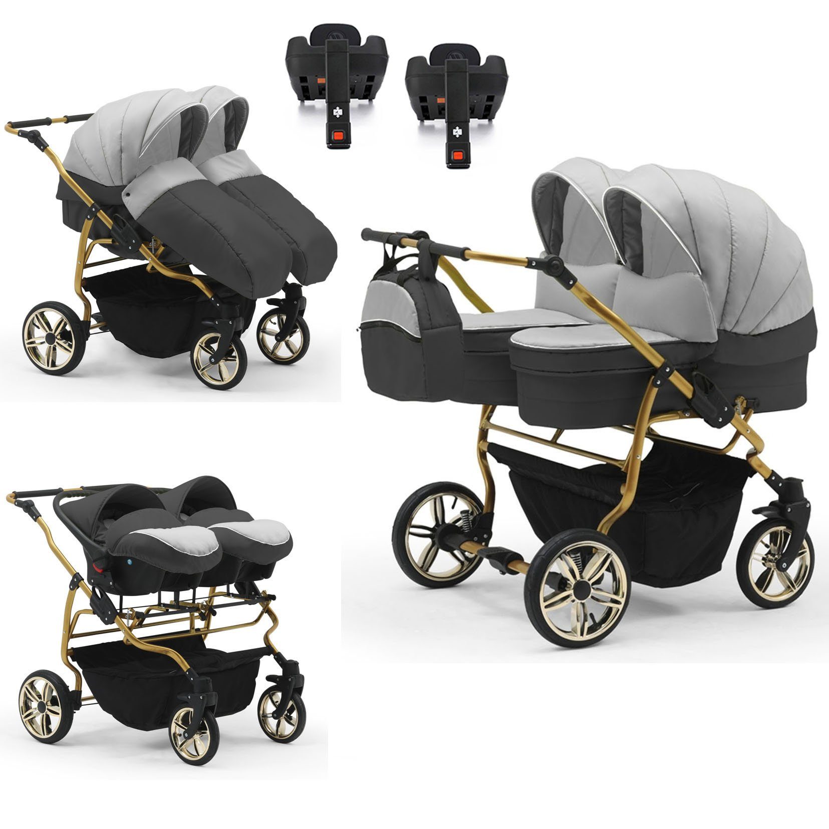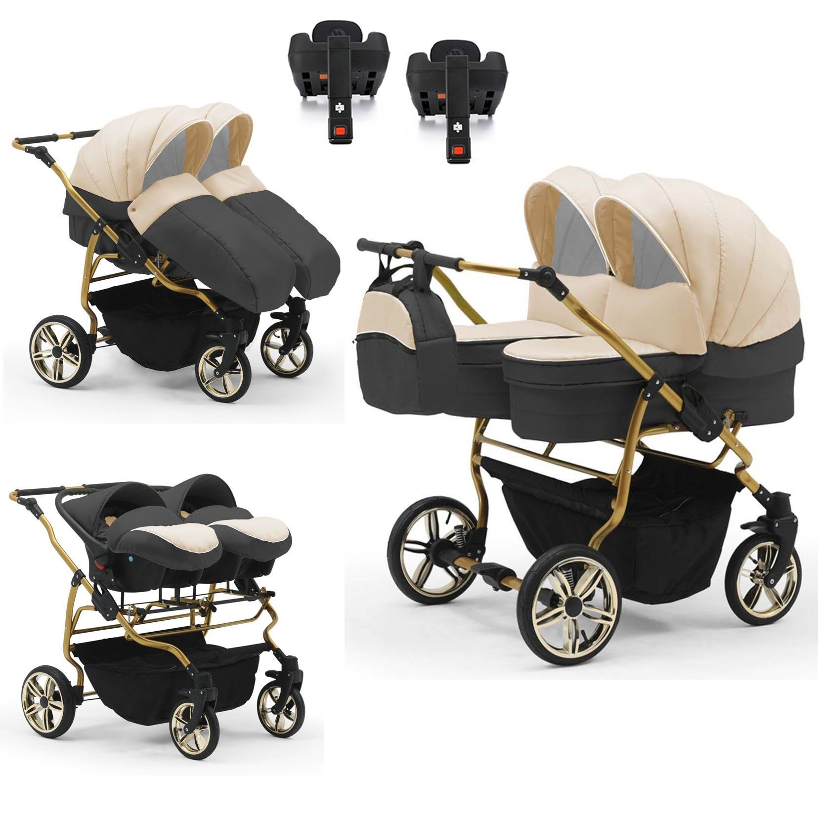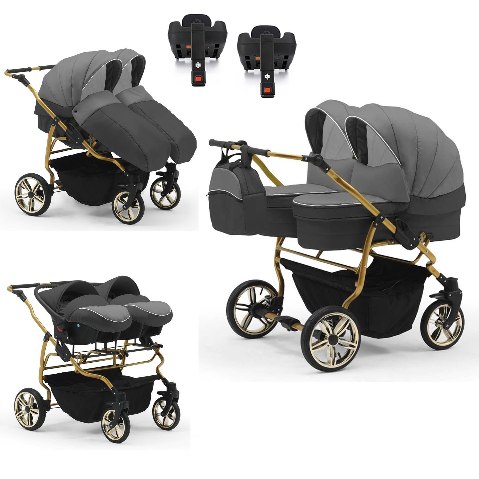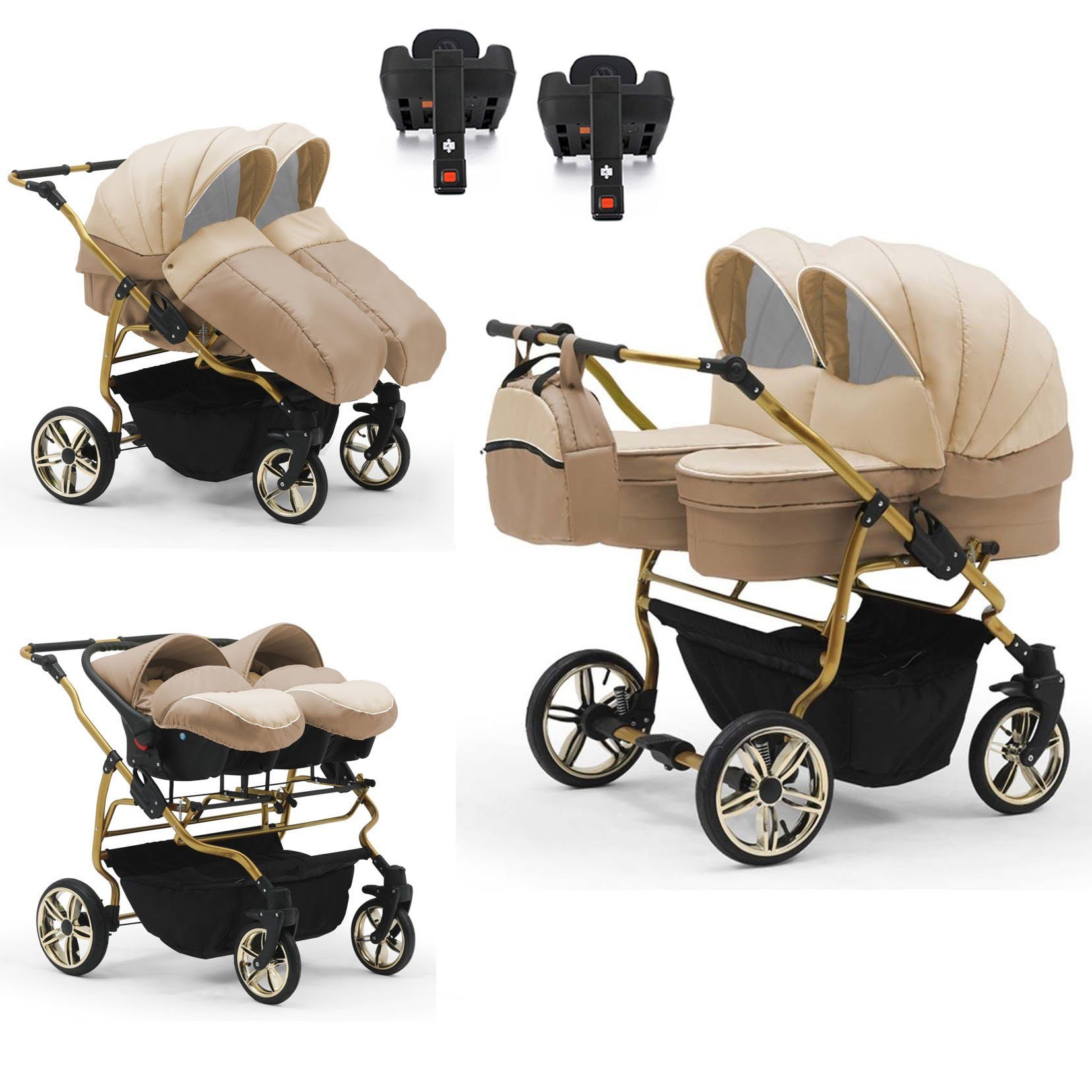IHR SORGLOSPAKET - Das Zwillingswagen-Set Duet Lux Goldedition ist ein 3 in 1 Multitalent. Er wird mit 3 Aufsätzen - 2 x Wanne, 2 x Sportsitze und 2 x Autositze - die sich einfach auf das Gestell anbringen lassen - an Sie geliefert. Der Lieferumfang lässt keine Wünsche offen: Zwillingswagen mit Gestell, Räder und 2 Wannen, 2 x Wannenabdeckung, 2 x Matratze, 2 x Inlay, 2 x Sportsitz inkl Beindecken und Bauchbügel, Wickeltaschem, Regenfolie, Insektennetz, 2 x Autositze inkl. Dach und Beindecken ,Gestelladapter und 2 Iso Bases für den PKW. Всеs was Sie und Ihre Kinder von Geburt bis zum 4. Lebensjahr für Unterwegs benötigen.
