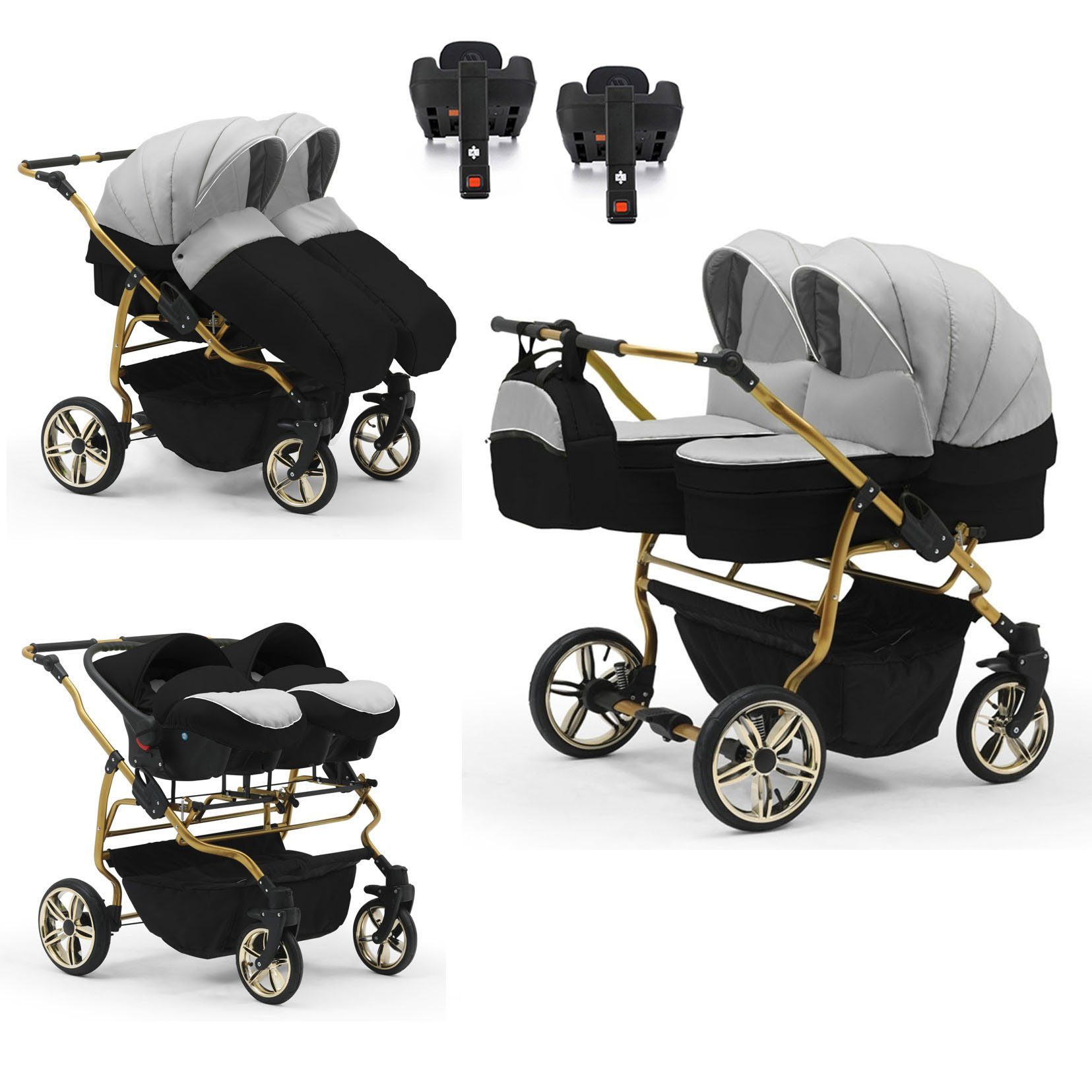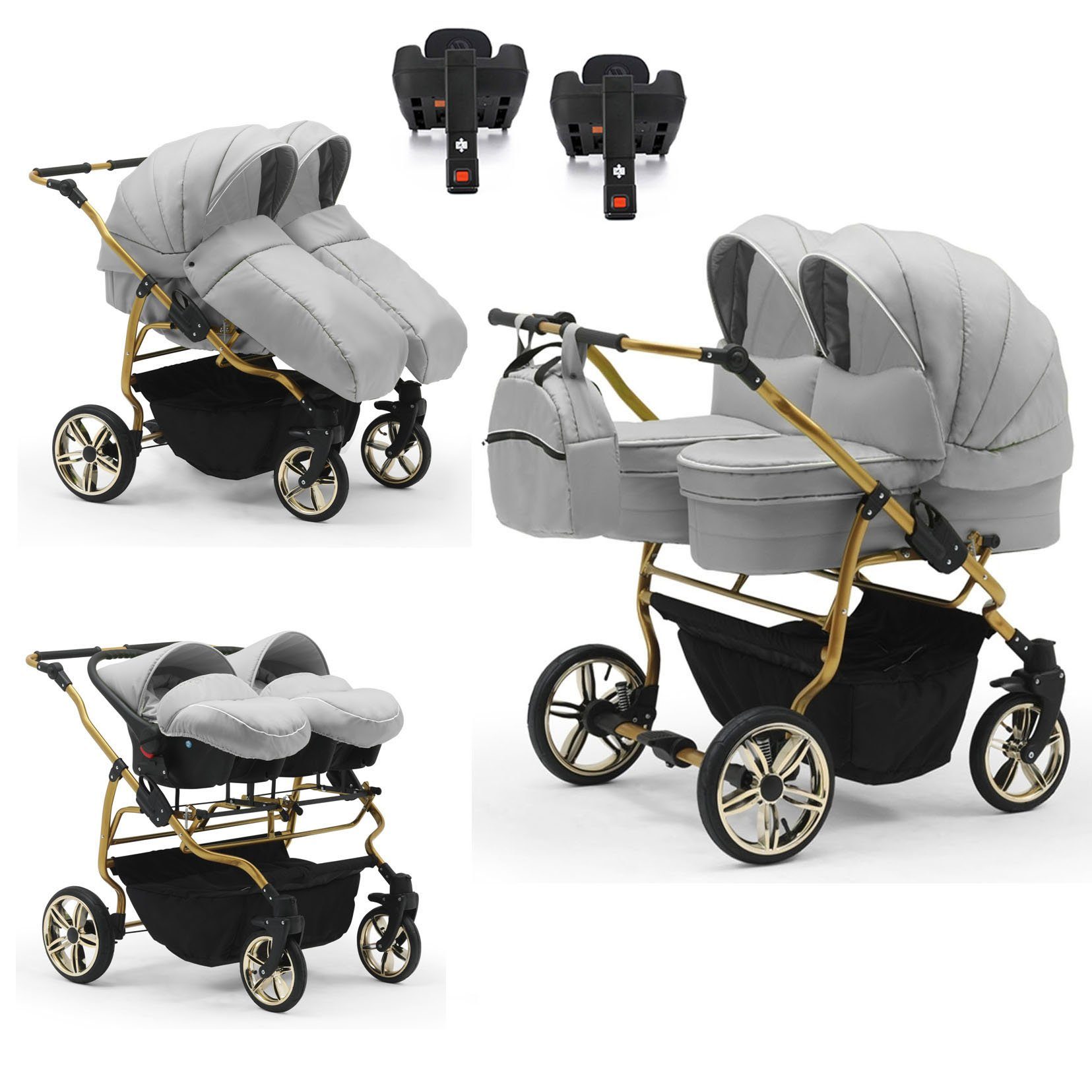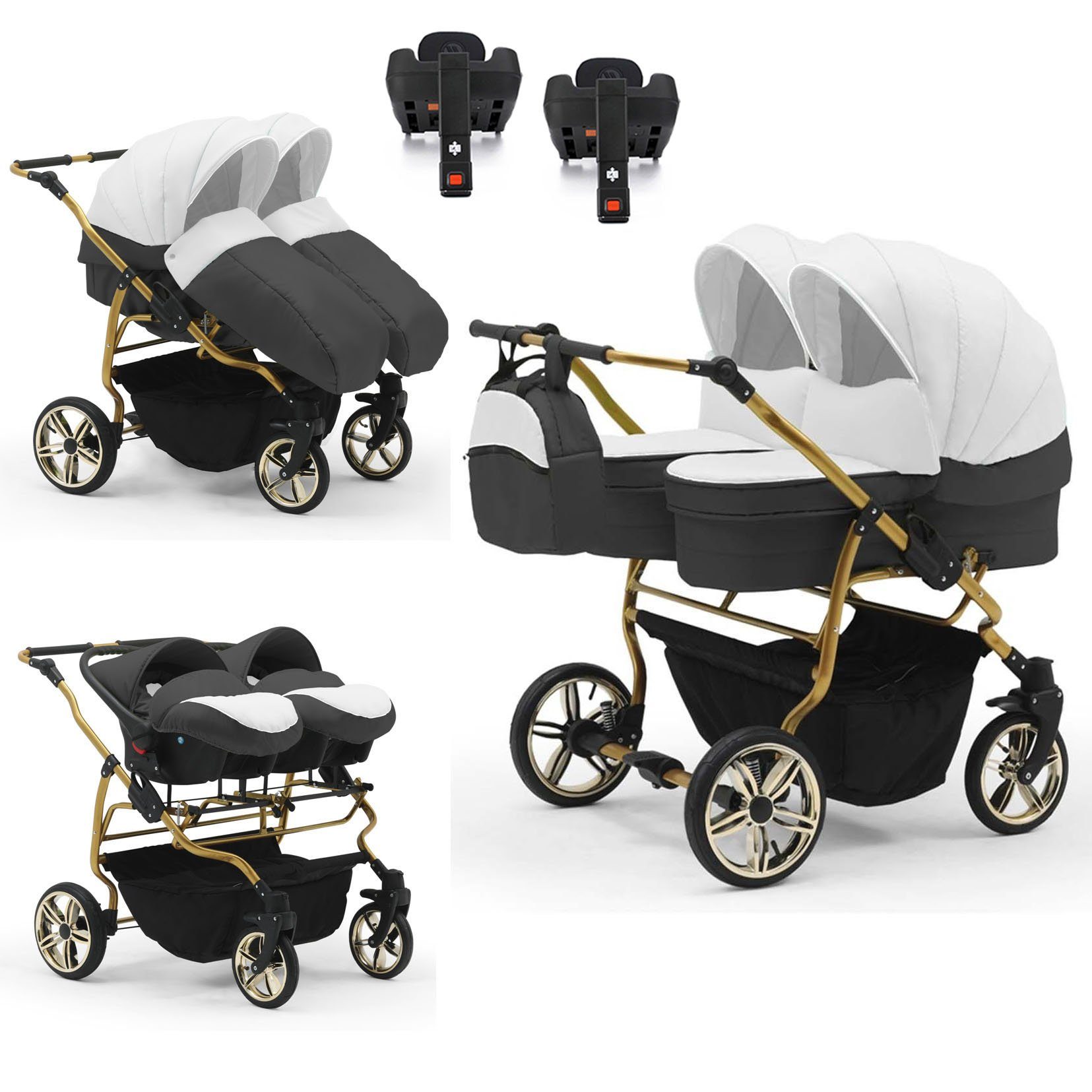 IHR SORGLOSPAKET - Das Zwillingswagen-Set Duet Lux Goldedition ist ein 3 in 1 Multitalent. Er wird mit 3 Aufsätzen - 2 x Wanne, 2 x Sportsitze und 2 x Autositze - die sich einfach auf das Gestell anbringen lassen - an Sie geliefert. Der Lieferumfang lässt keine Wünsche offen: Zwillingswagen mit Gestell, Räder und 2 Wannen, 2 x Wannenabdeckung, 2 x Matratze, 2 x Inlay, 2 x Sportsitz inkl Beindecken und Bauchbügel, Wickeltaschem, Regenfolie, Insektennetz, 2 x Autositze inkl. Dach und Beindecken ,Gestelladapter und 2 Iso Bases für den PKW. Всеs was Sie und Ihre Kinder von Geburt bis zum 4. Lebensjahr für Unterwegs benötigen.