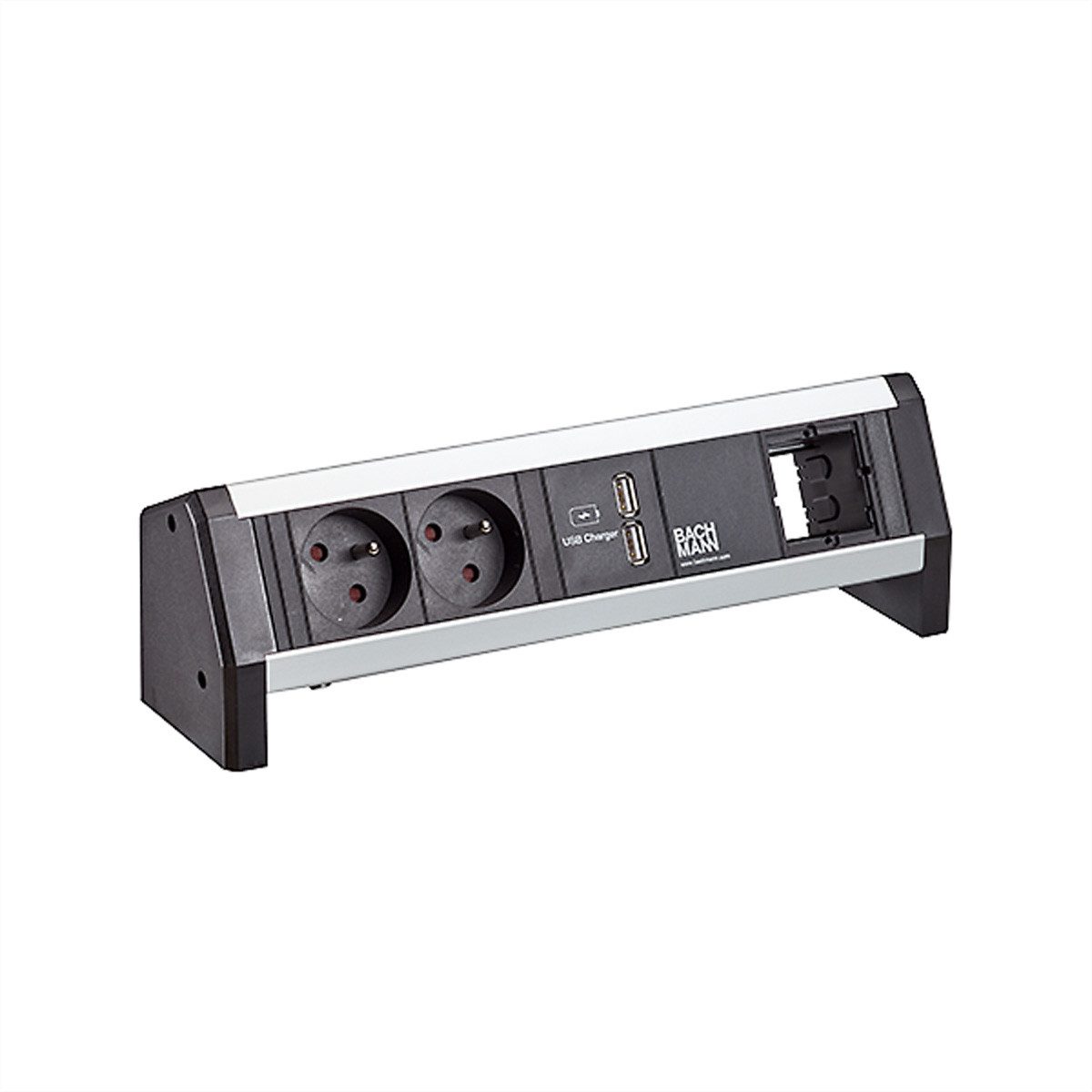 DESK Steckdosenleiste 2xUTE Steckdosen Frankreich 35°, schwarz 1xUSB Doppelcharger 5V DC / 3,1A 1xCustom Modul leer Strom 1,0m H05VV-F3G 1,5mm² mit GST18 Stecker mit BACHMANN Logo verpackt im Karton