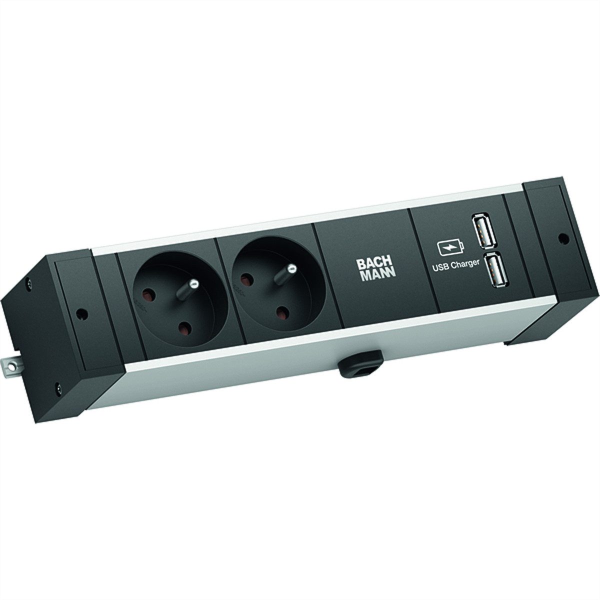 DESK RAIL Steckdosenleiste mit erhöhtem Berührungsschutz 2xUTE Steckdosen Frankreich, schwarz 1xUSB Doppelcharger 5V DC / 3,1A Zuleitung 2m H05VV-F3G1,5mm² schwarz mit GST18 Stecker Profil: Aluminium eloxiert (natur) Endkappen: Kunststoff schwarz mit BACHMANN Logo verpackt im Karton