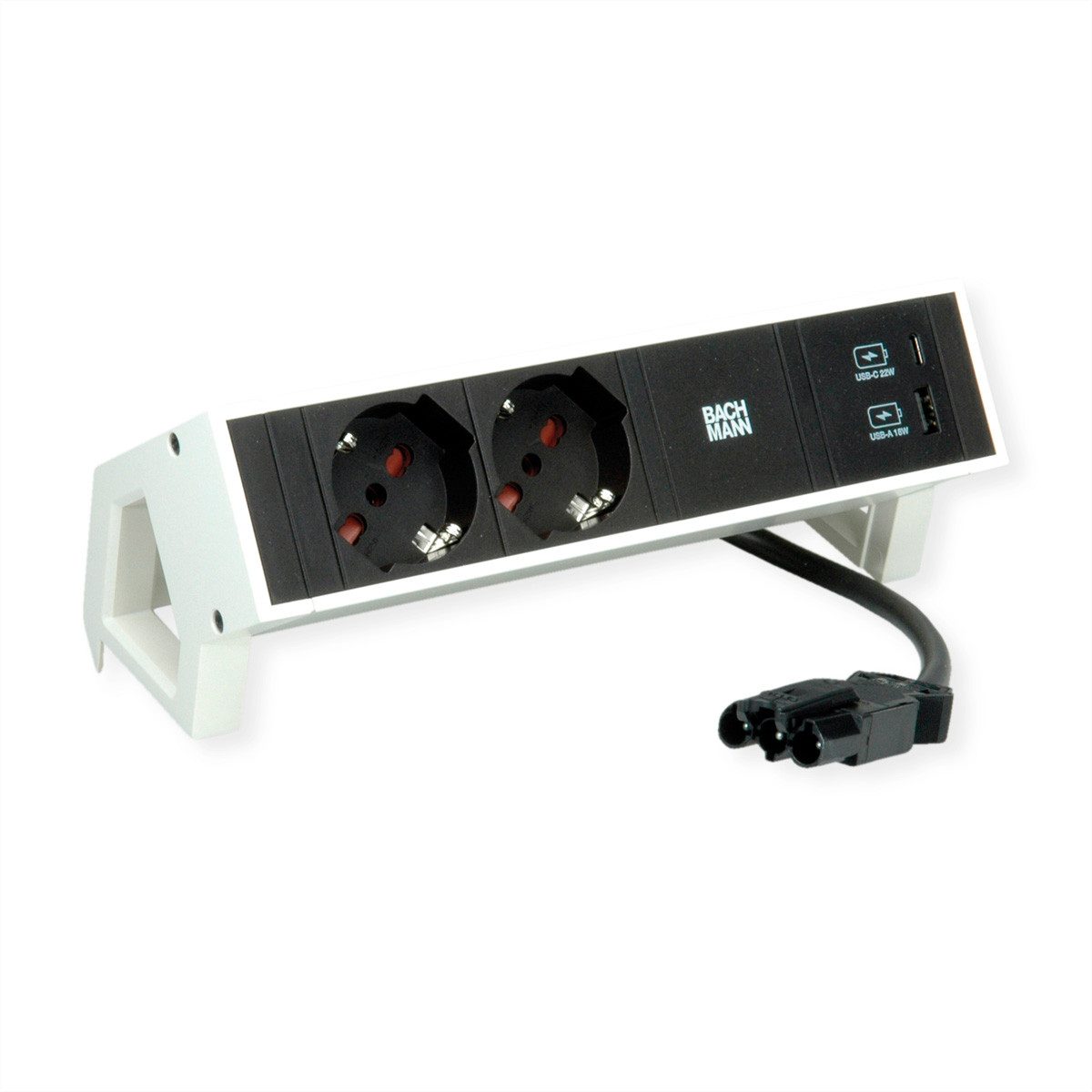 DESK 2 Steckdosenleiste Farbe weiss, ähnlich RAL9010 mit erhöhtem Berührungsschutz 2x P40 Steckdosen Italien schwarz 1xUSB A/C 22W Charger Zuleitung 0,2m H05VV-F3G1,5mm² schwarz mit GST18 Stecker inkl. Haltewinkel mit BACHMANN Logo verpackt im Karton