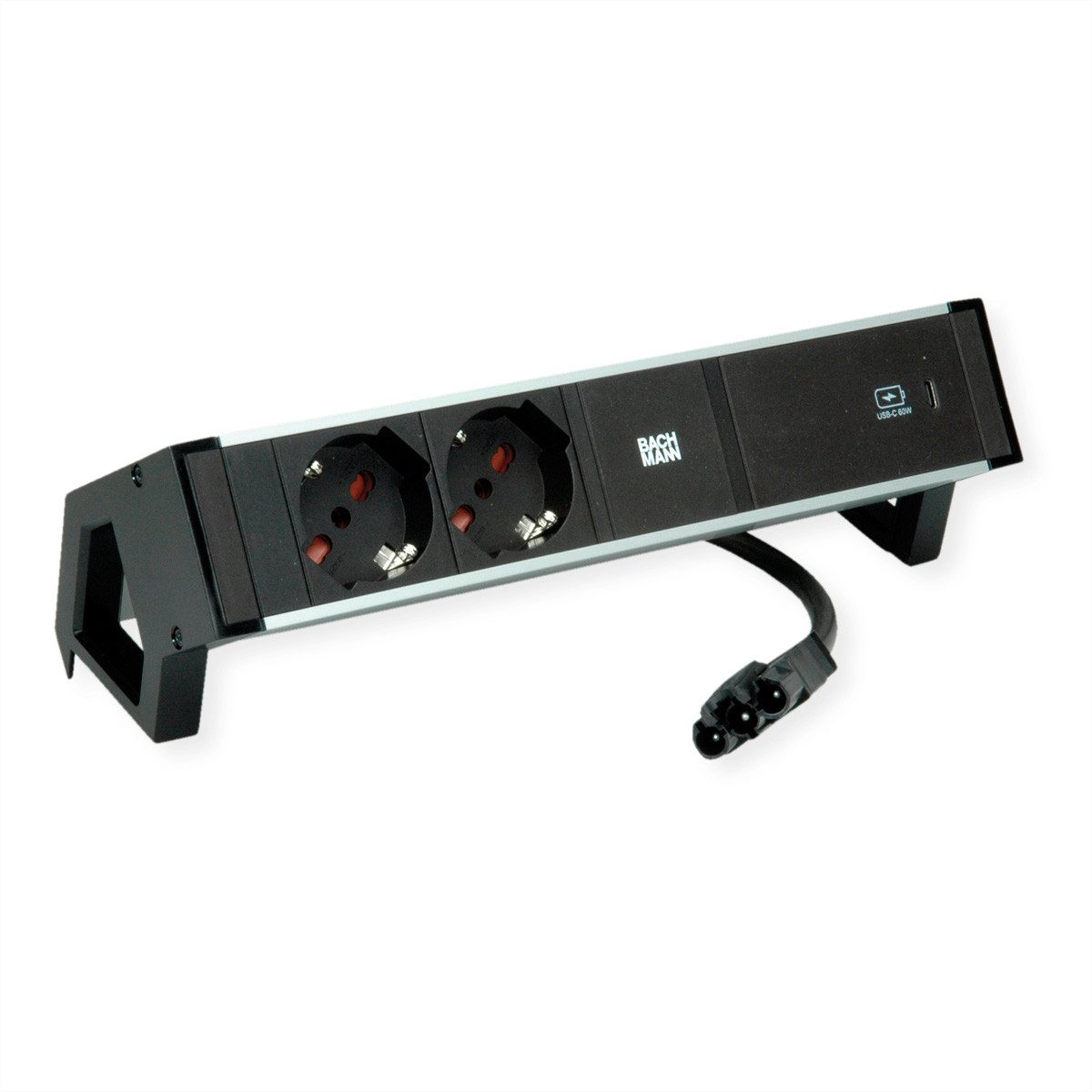 DESK 2 ALU BLACK Steckdosenleiste mit erhöhtem Berührungsschutz 2xITA P40 Steckdosen Italien schwarz 1xUSB C 60W Charger Zuleitung 0,2m H05VV-F3G1,5mm² schwarz mit GST18 Stecker Profil: Aluminium eloxiert (natur) Endkappen: Kunststoff schwarz inkl. Haltewinkeln mit BACHMANN Logo verpackt im Karton