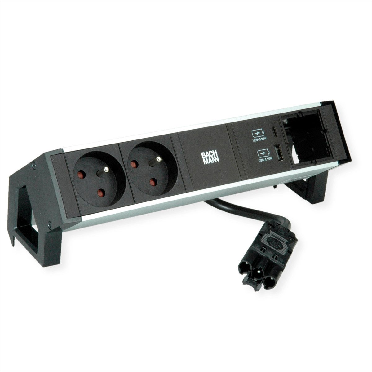 DESK 2 ALU BLACK Steckdosenleiste mit erhöhtem Berührungsschutz 2xUTE Steckdosen Frankreich schwarz 1xUSB A/C 22W Charger 1xCustom Modul leer Zuleitung 0,2m H05VV-F3G1,5mm² schwarz mit GST18 Stecker Profil: Aluminium eloxiert (natur) Endkappen: Kunststoff schwarz inkl. Haltewinkel mit BACHMANN Logo verpackt im Karton