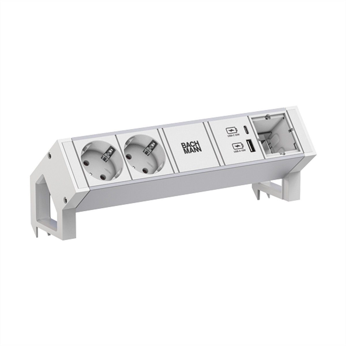 DESK 2 ALU WHITE Steckdosenleiste Aluminiumprofil eloxiert (natur) Endkappen Kunststoff weiß, ähnlich RAL9010 mit erhöhtem Berührungsschutz 2xSchutzkontaktsteckdosen 35° weiß 1xUSB A/C 22W Charger 1xCustom Modul leer Kunststoffkomponenten weiß ähnlich RAL9010 Zuleitung 0,2m H05VV-F3G1,5mm² weiß mit GST18 Stecker weiß mit BACHMANN Logo inkl. Haltewinkel verpackt im Karton