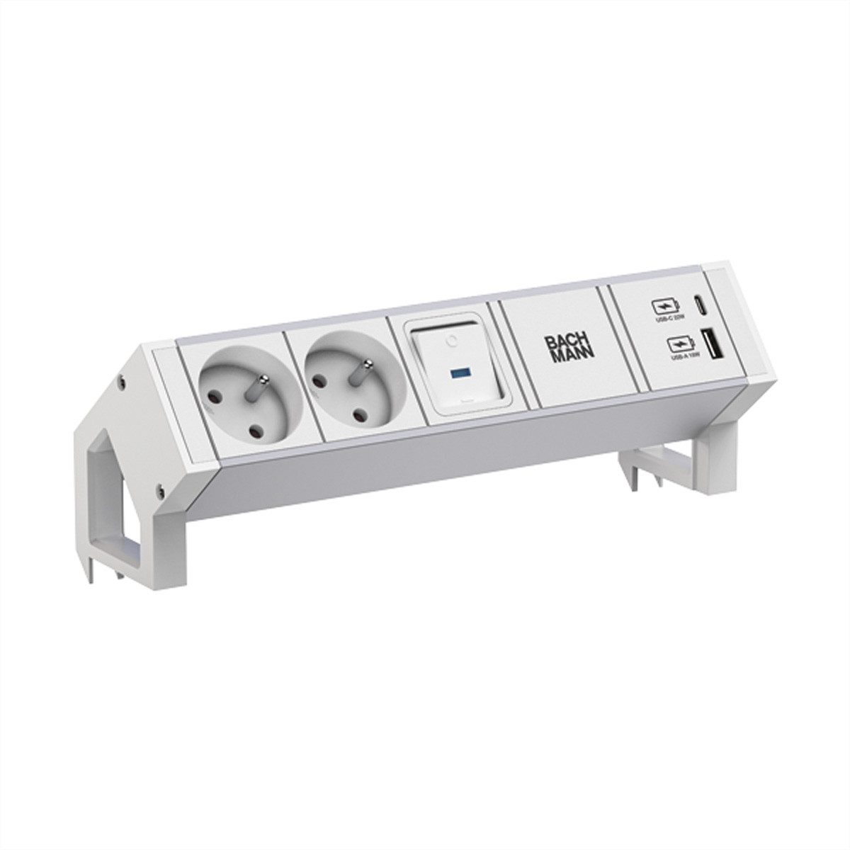 DESK 2 ALU WHITE Steckdosenleiste Aluminiumprofil eloxiert (natur) Endkappen Kunststoff weiß, ähnlich RAL9010 2xUTE Steckdosen Frankreich weiß 1xSchalter 1xUSB A/C 22W Charger Kunststoffkomponenten weiß ähnlich RAL9010 Zuleitung 0,2m H05VV-F3G1,5mm² weiß mit GST18 Stecker weiß mit BACHMANN Logo inkl. Haltewinkel verpackt im Karton