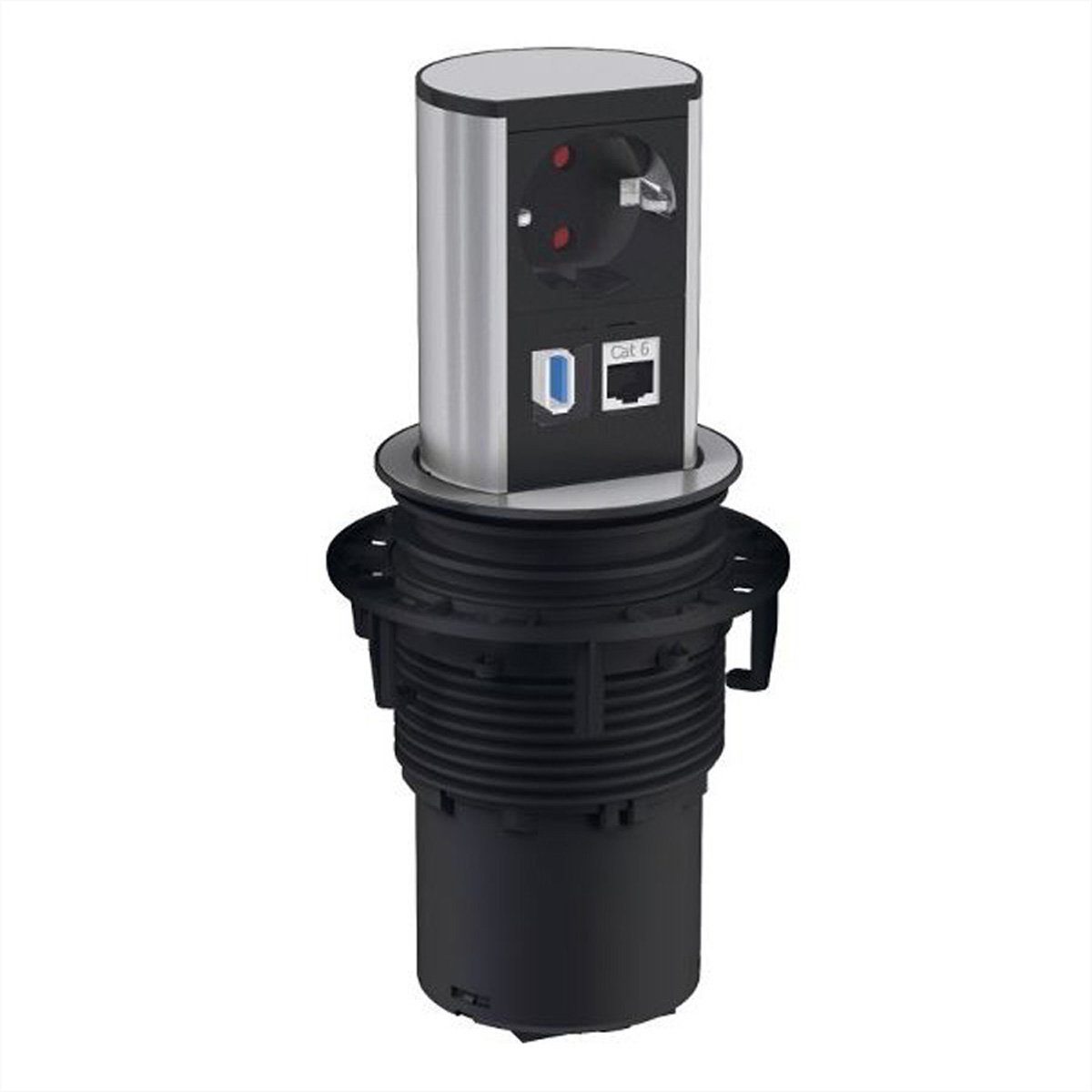 Lieferumfang | Steckdosenturm, Tischbefestigung, Schutzkontakt-Montagestecker |