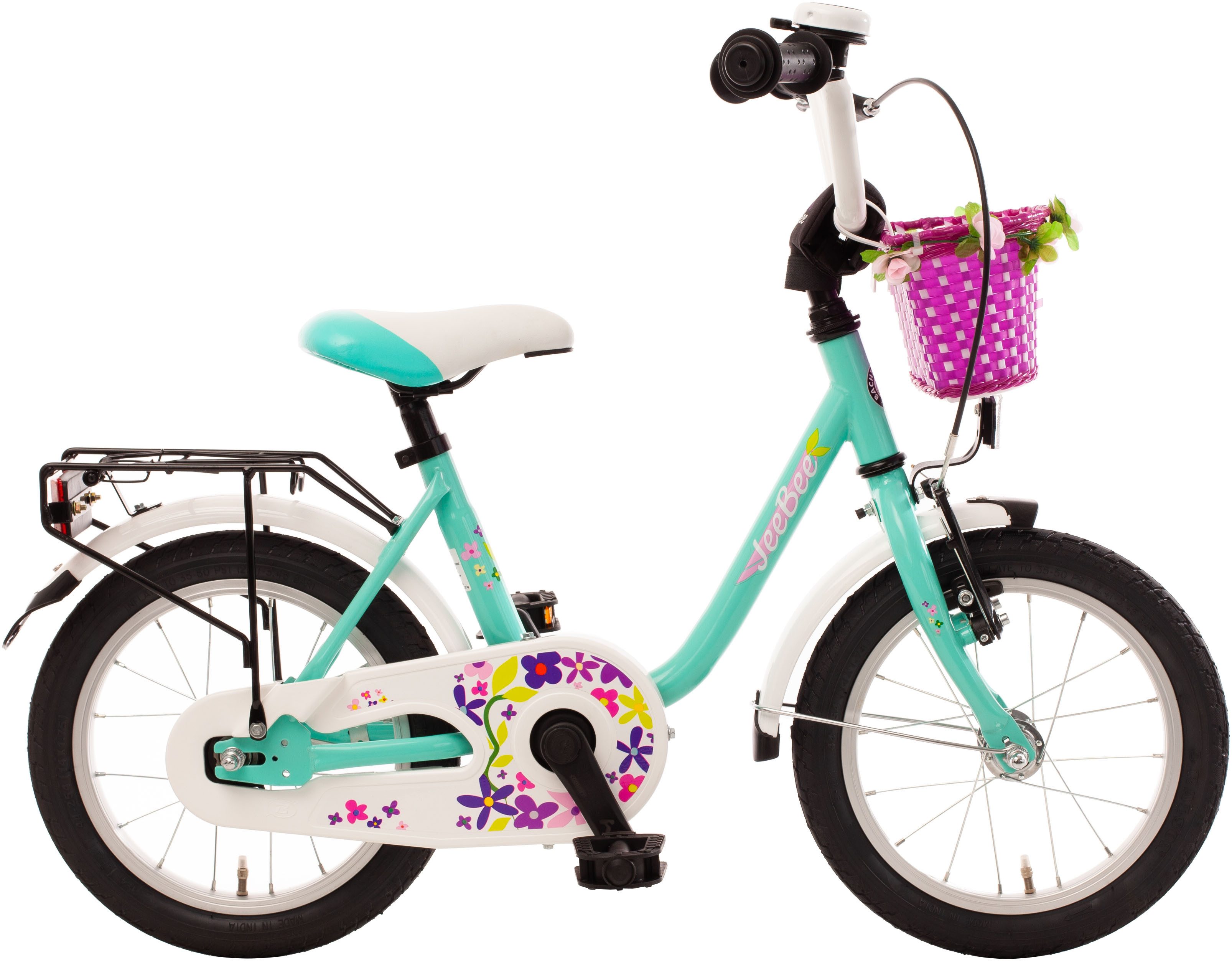 Die Blumen im Dekor verzaubert sofort Groß und Klein. Im Lenkerkorb mit Blumen findet sich Platz für alles was Blumenmädchen so brauchen. Das JeeBee-Kinderfahrräder hat durch die Verwendung von Aluteilen das Gewicht reduziert. Mit dem klassischen und tiefen U-Type-Rahmen sorgen für einen sehr sicheren und bequemen Auf- und Abstieg. Der vollständig geschlossene Kettenkasten besticht nicht nur optisch sondern entspricht mit seiner Konstruktion den gesetzlich vorgeschriebenen Eingriff Schutz entsprechend der Sicherheitsnorm DIN EN ISO 8098 (Sicherheitstechnische Anforderungen an Kinderfahrrädern). Zwei unabhängig voneinander bedienbare Bremsen sorgen für sicheres Stoppen. Die klassische Rücktrittbremse verliert auch bei nassen Witterungsverhältnissen nicht an Bremsleistung. Sie ist zudem nahezu wartungsfrei. Das Vorderrad wird kinderleicht durch einen Handbremshebel bedient. Der Abstand zum Bremshebel ist für kleine Kinderhände einstellbar.